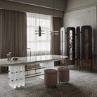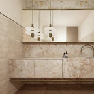 The translucent alabaster planes of the Apparatus Series are intersected by a fluted brass form, referencing traditional middle eastern jewellery while pushing it through a futurist lens. The stone glows from a light source that remains hidden, illuminating the relationship between the solid and the permeable.