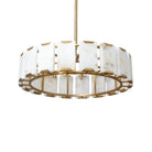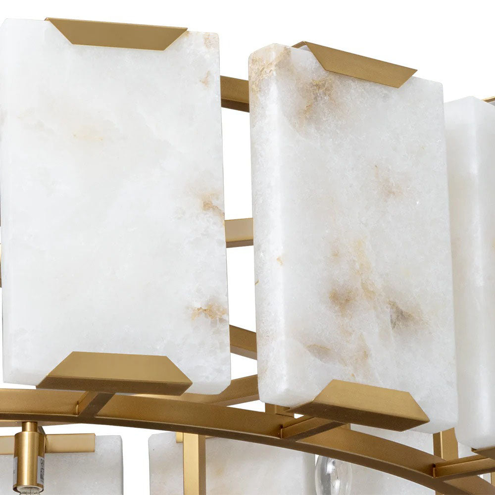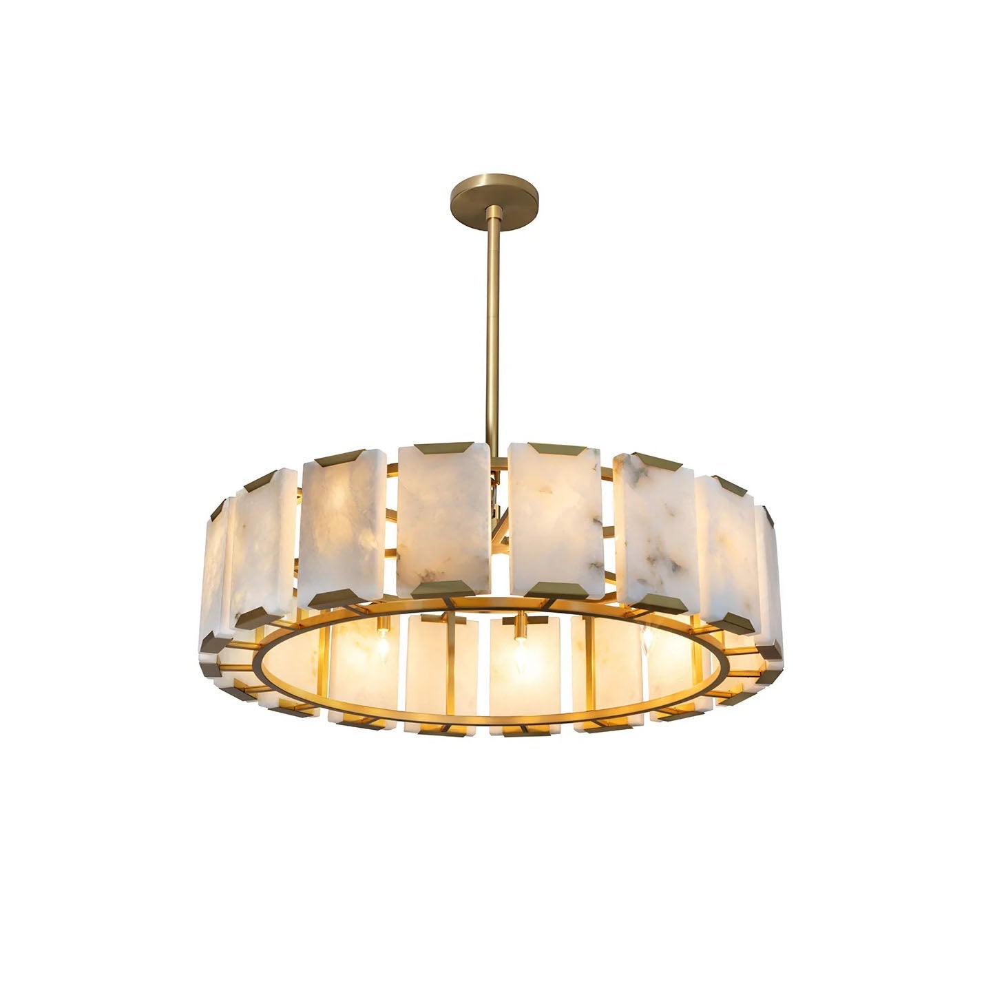 The Rovira Chandelier from Sunpan is a luminous tribute to the organic elegance of natural stone. This striking circular fixture features eighteen hand-carved panels of genuine Spanish alabaster, each nearly an inch thick, nestled within a radiant brushed gold frame. Known for its soft translucency, the alabaster diffuses light to create a warm, ethereal glow that highlights the unique veining and mineral character inherent in every piece, making this chandelier a sophisticated focal point for refined interiors.