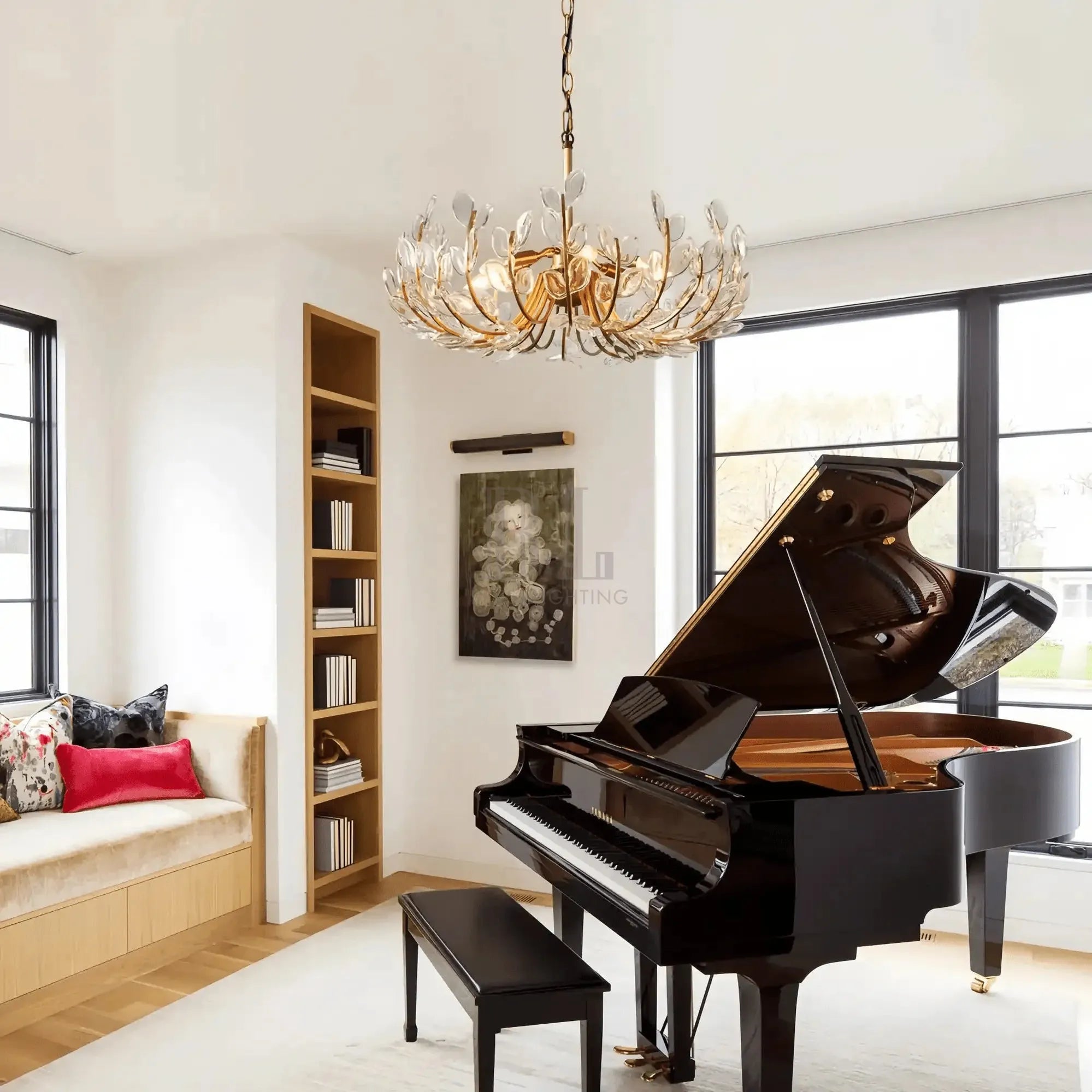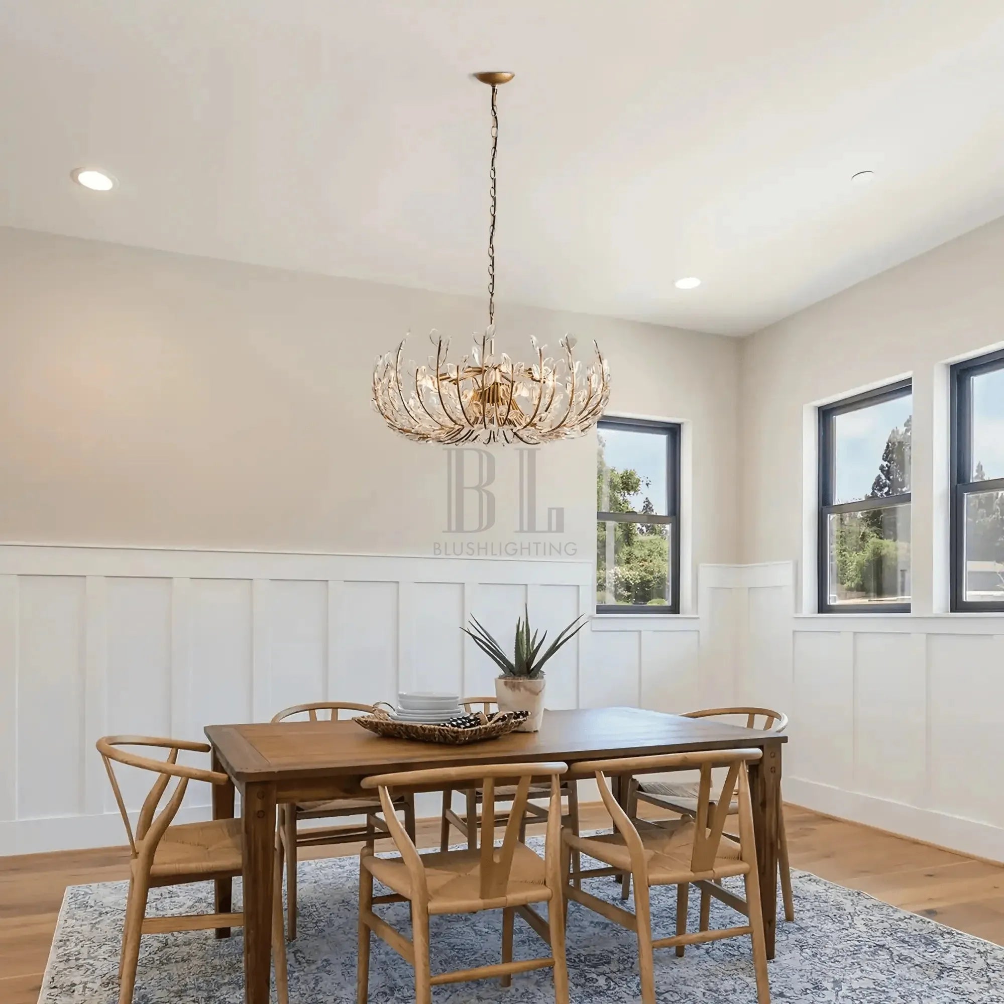 Handcrafted from steel with a brass finish, the Adela Collection by blushlighting features sculpted glass petals that scatter light with organic elegance. Steel branches add structure, creating a timeless statement for any space.