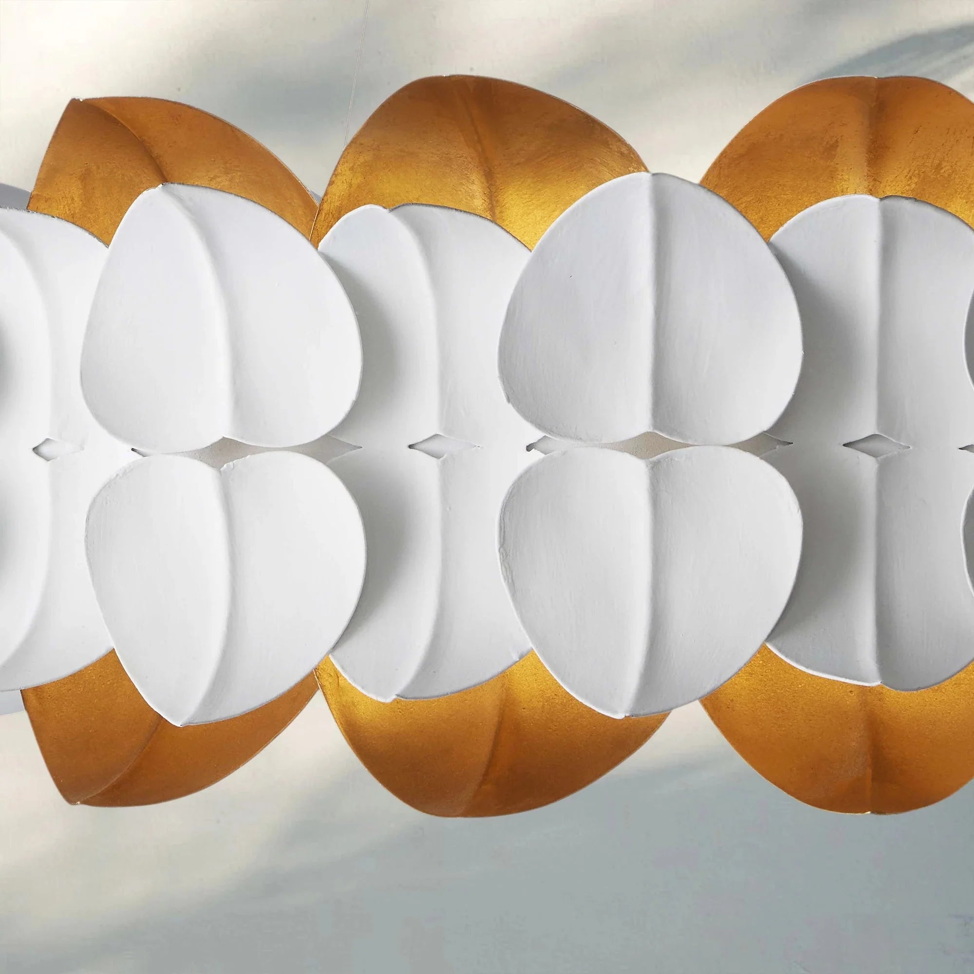 Hand-sculpted leaves in glossy white and shimmering gold form the luminous crown on our Darla Chandelier. Integrated LEDs create a warm inner glow, highlighting every intricate detail.