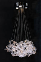 This refreshing and captivating design softly brightens the space. offering a "light-as-air" impression as a dining or living room light fixture. The intricate glass knots hover gently from fine. thin cables—illuminated by the lights embedded above. This unique light fixture is made with curvaceous glass. bringing movement in doors. The transitional design creates alluring shadow effects to your modern contemporary house. Adjust the suspension wires and create your own look and design (more flat or more of a ball shape body as shown).