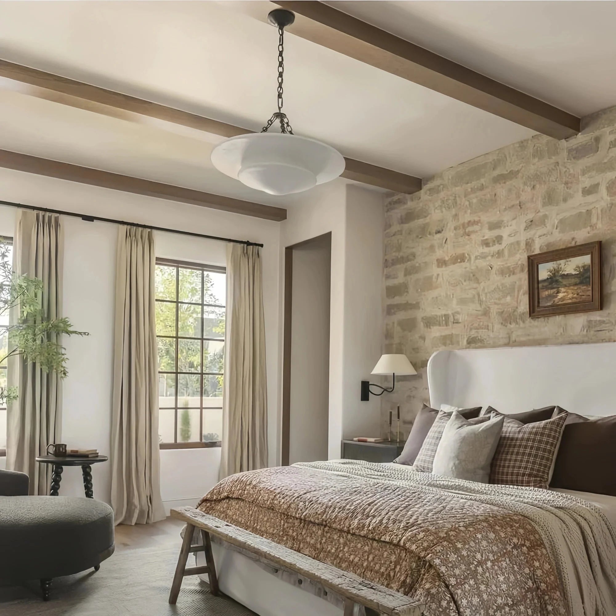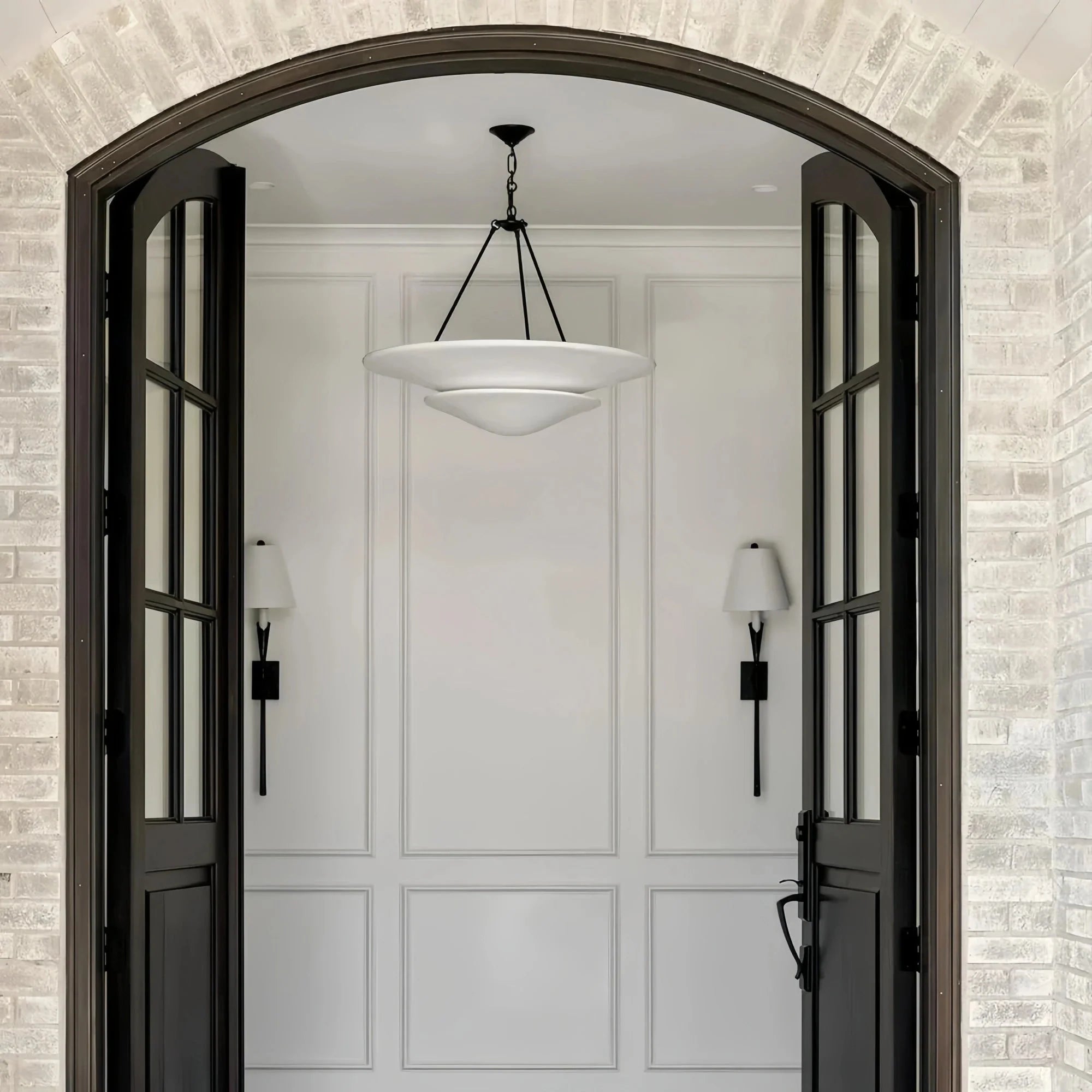 The Molly Chandelier adds elegance to any space with its modern take on classic design. Its shallow bowl-shaped shade, suspended by a fine chain and rod, creates a warm, inviting glow. Perfect as a statement piece in entryways or dining rooms.