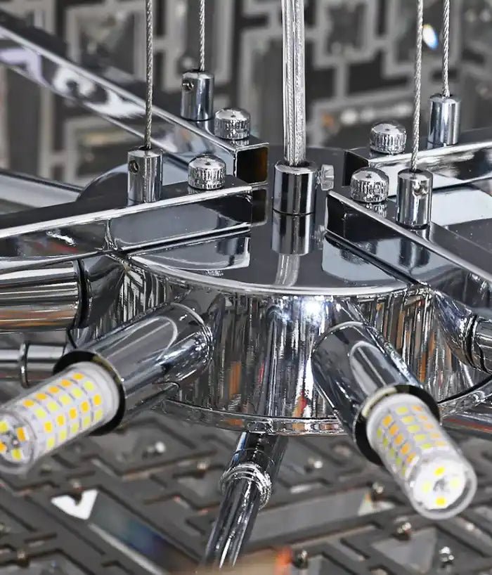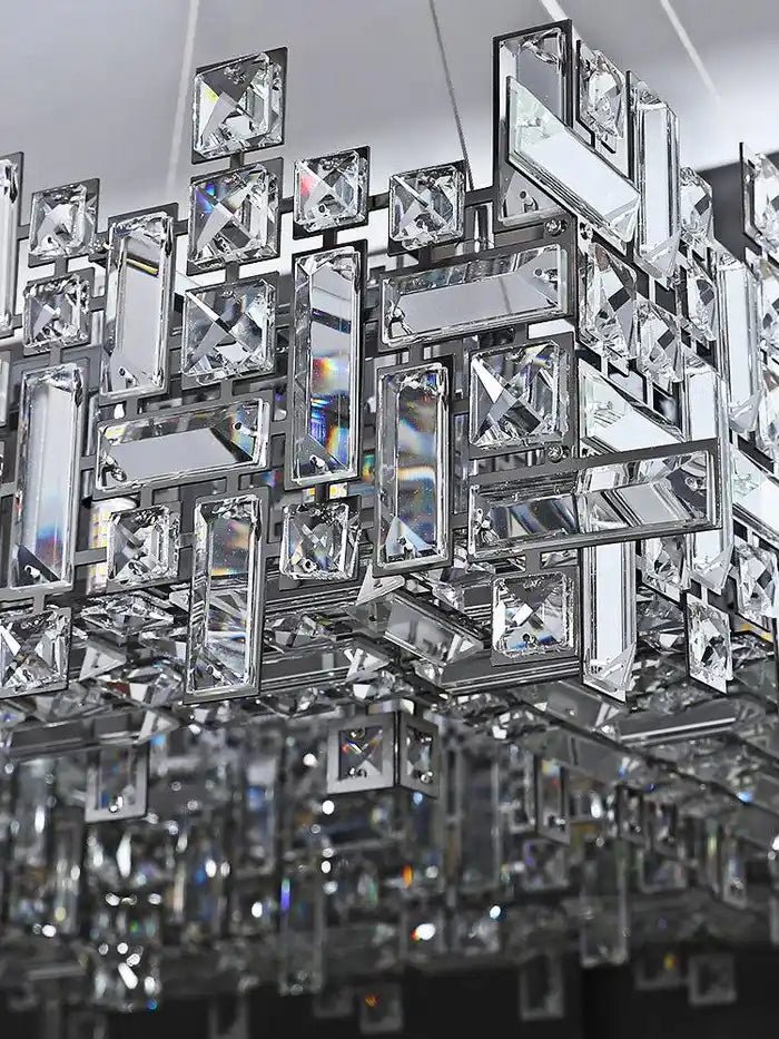 Combining the elegance of traditional rectangle and square design with the sleekness of a post-modern fixture, this chandelier suit is a collection of numrous little crystal blocks, which are all irregularly together in chrome finish. Inclined form grants the chandelier cool modern sense and ethereal feelings. The square style is suitable for dining room and bedroom. The rectangle style is compatible with large living room, kitchen island or bar. Collocation of the two is a fine match.
