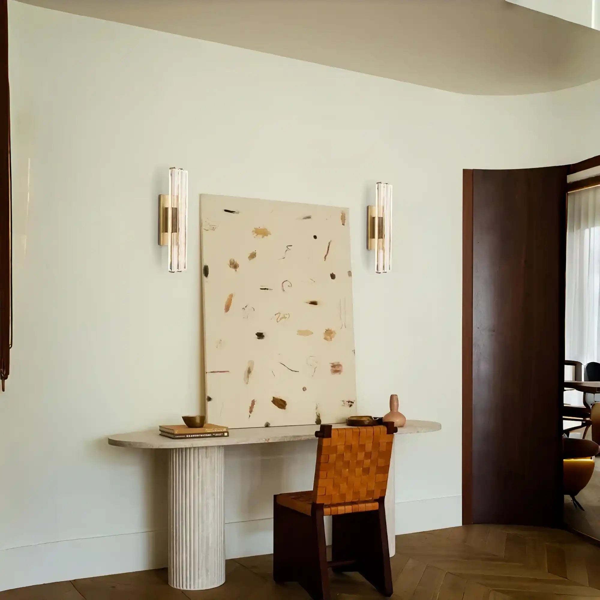 Capturing the spirit of 1960s Italian minimalism, Auduban appears to cascade from above with ten prisms of hand-polished K9 crystal on vertical brass drops. At once striking and restrained, the collection by Joseph Jeup evokes the warmth of candlelight with elongated LEDs that shed beautiful light through the undulating texture of the glass.