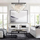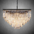 Inspired by the Art Deco Square Chandelier style of 1920s Paris, the collection captures the period's fascination with geometric forms. Masterfully refracting the light, hundreds of faceted, dynamic prisms evoke the allure of the era. Hanging like lush fringe from a welded iron frame, the angular glass juxtaposes elegance and industrialism.