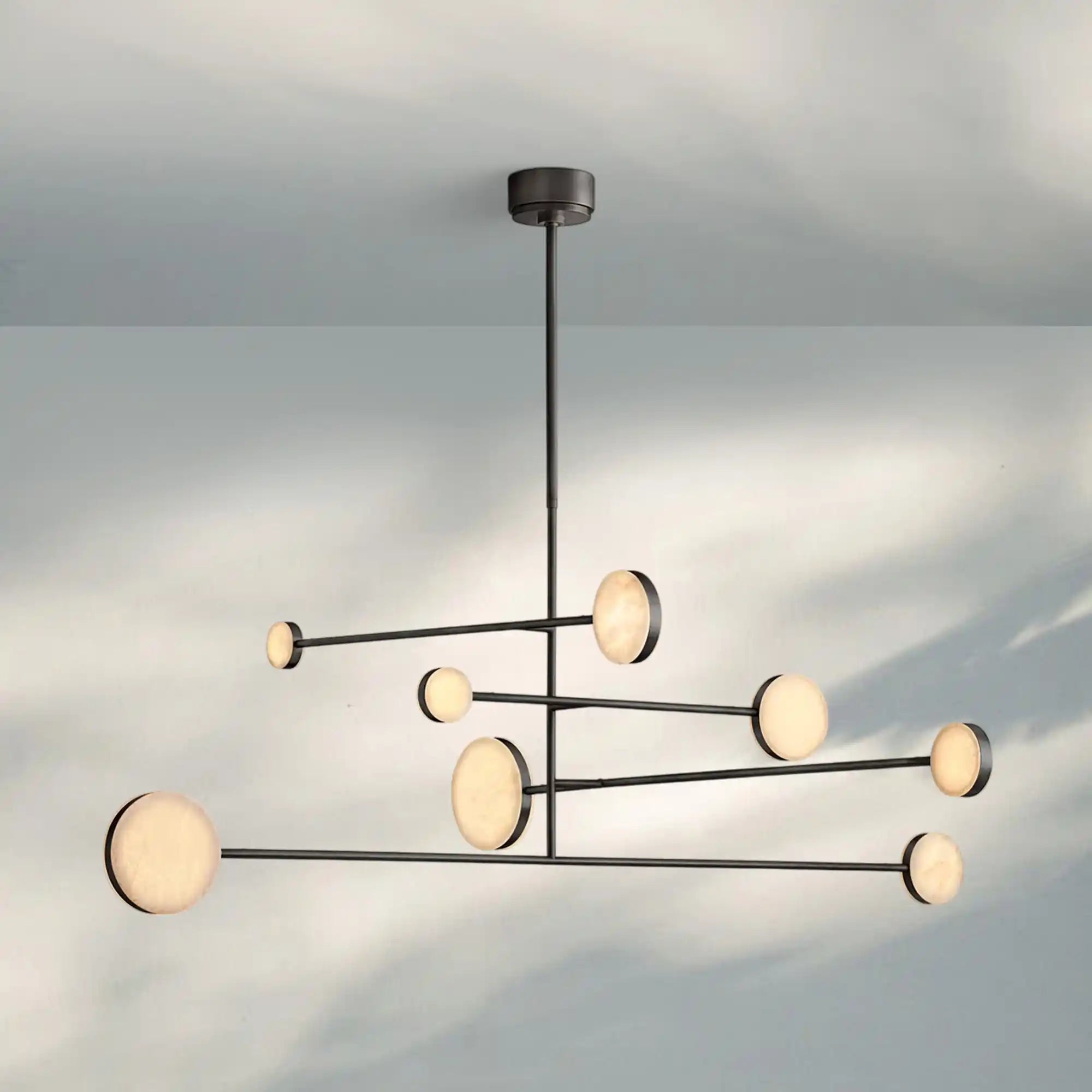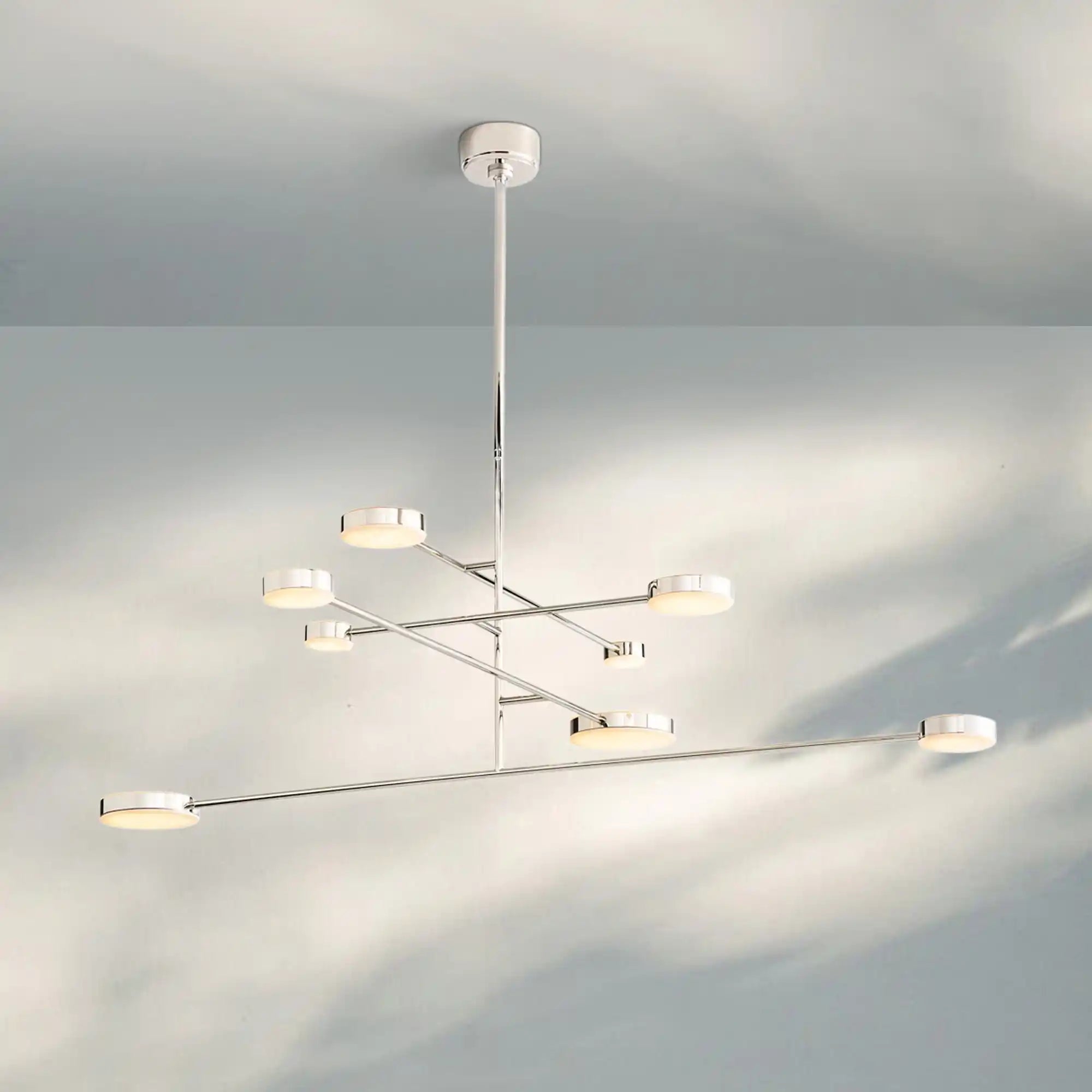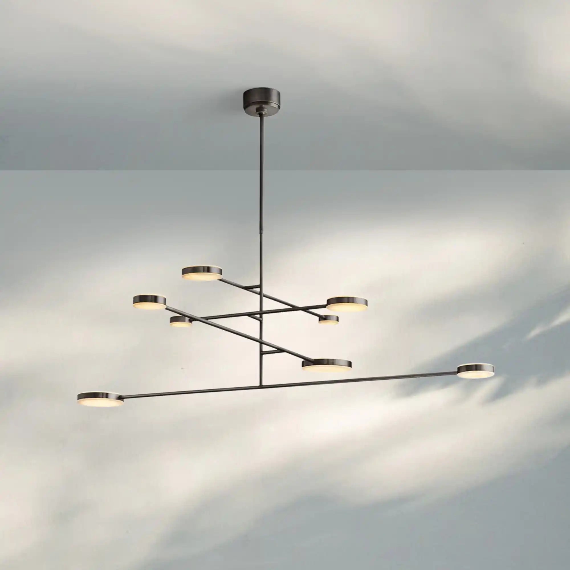 A study in balance and proportion, the contemporary Alexander collection by Chicago-based designer Ian K. Fowler blends art and functionality. Each alabaster disk can be rotated to direct illumination wherever it's preferred, while the slender arms create a kinetic dance of movement in space.