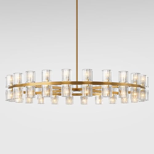 A dazzling gold wagon wheel chandelier that instantly upgrades any dining or kitchen space. The crystal shade houses 60 brilliant lights, delivering a warm, luxurious glow. Its adjustable height and sturdy brass construction make installation a breeze. Perfect for modern farmhouse interiors seeking a statement piece.