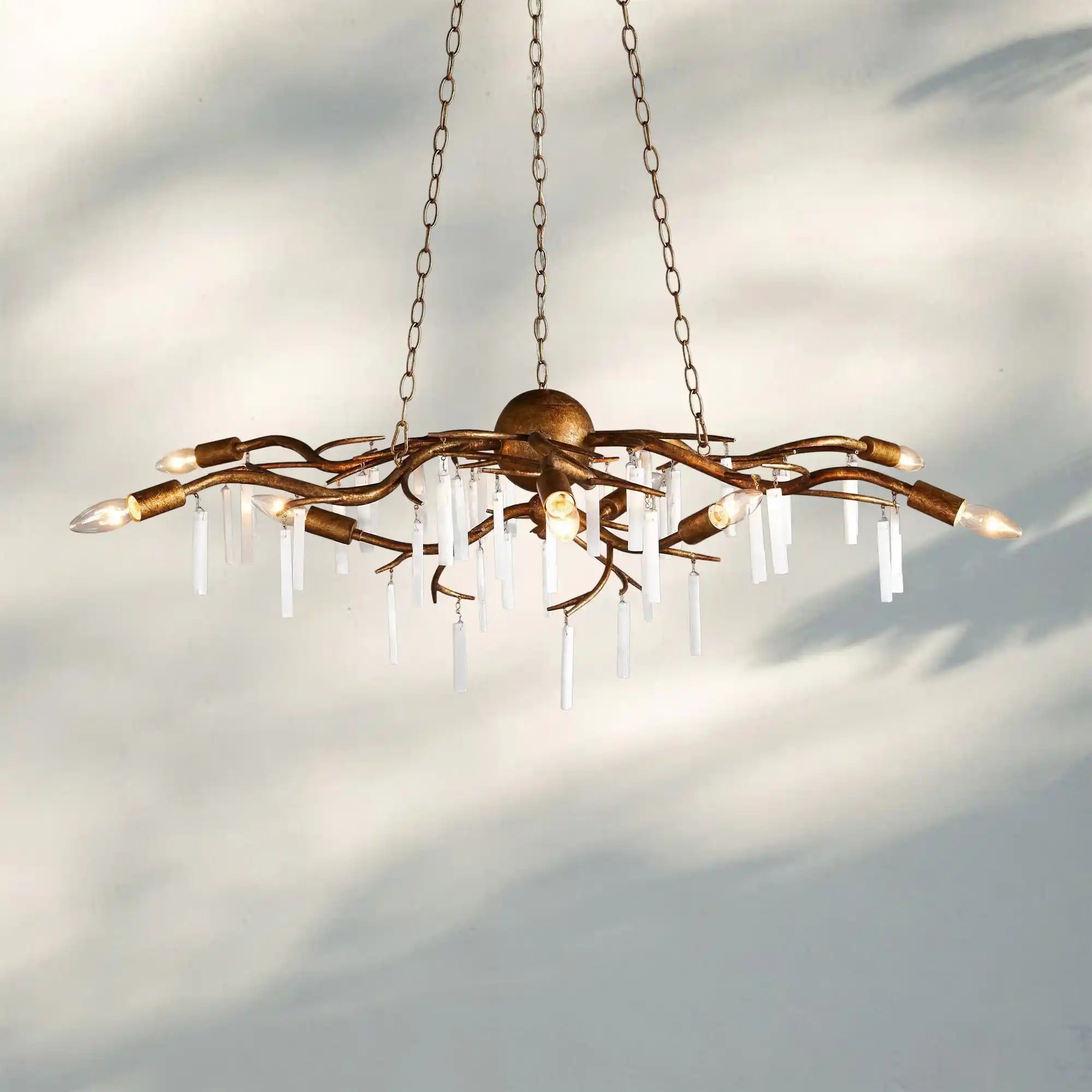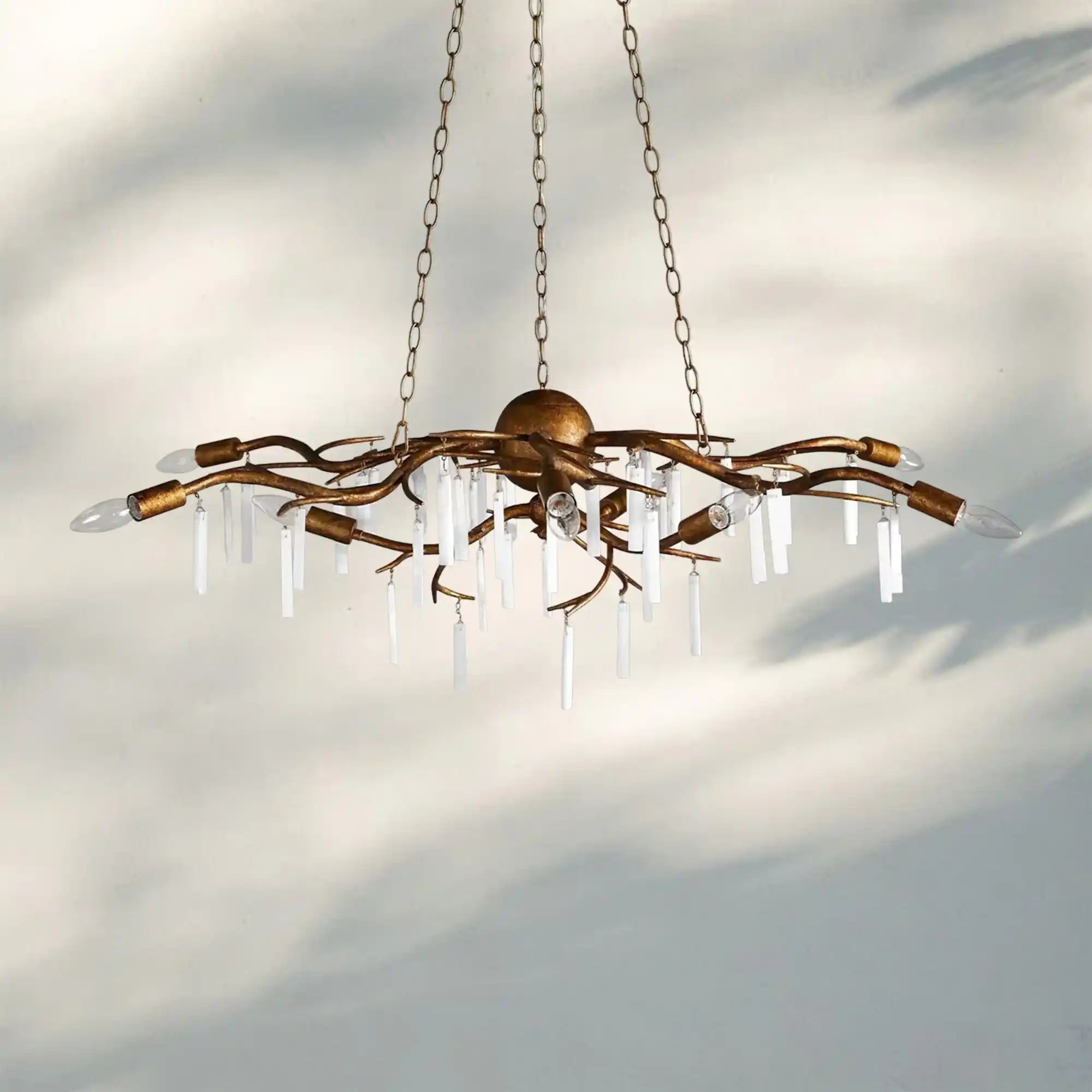 Fifty-one glimmering, natural selenite crystals adorn our Jada 9-Light Chandelier, reflecting light as they hang elegantly beneath the chandelier’s iron frame. An antiqued, gold-foil finish is hand-brushed by our artisans, creating a glamorous aesthetic.