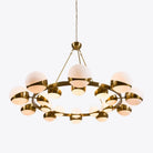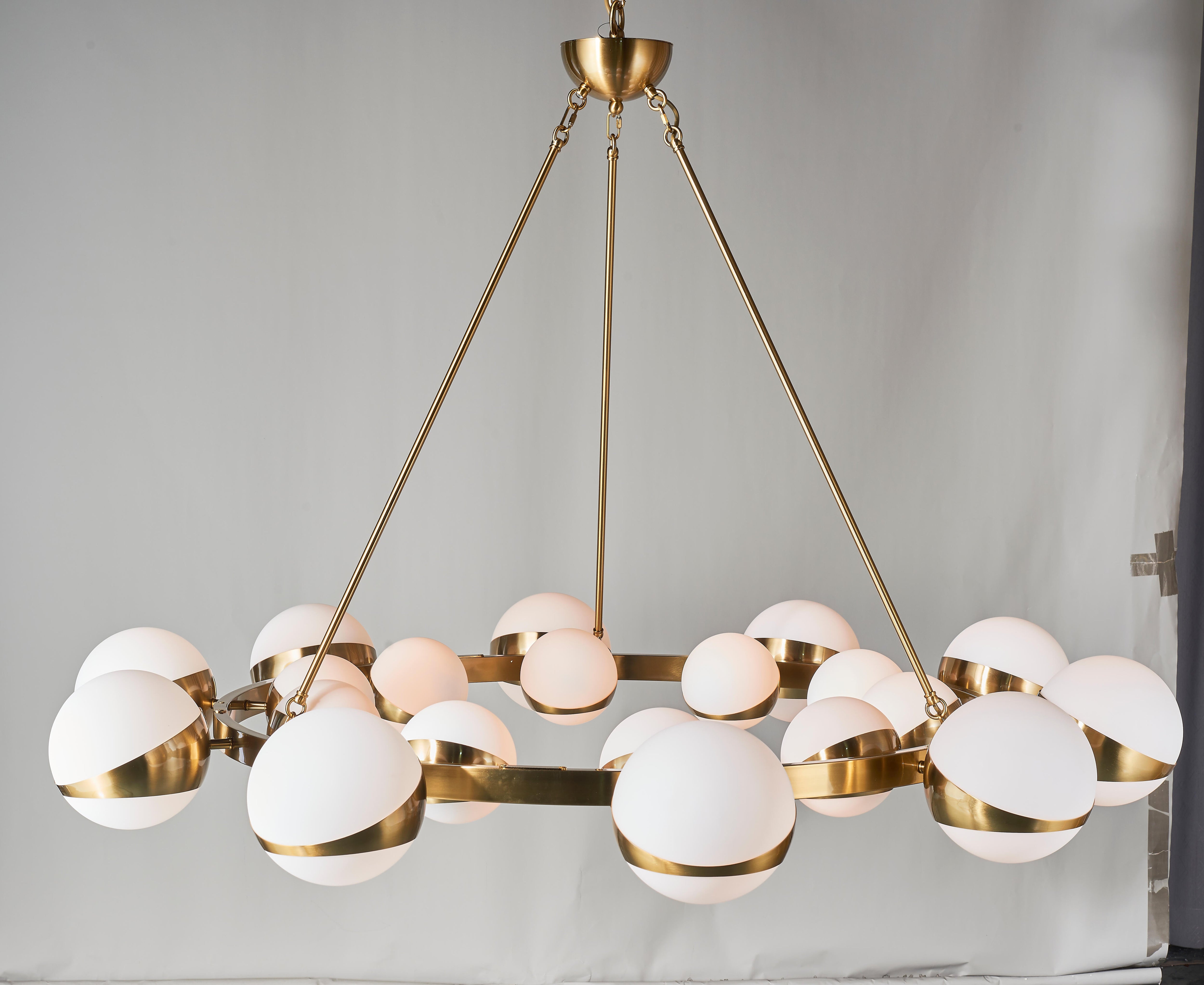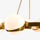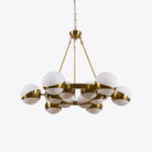 Introducing our new Lucca Sputnik chandelier, inspired by a 1970s Murano aesthetic. This elegant design comes in two sizes and showcases opaline glass globes adorning both the inner and outer edges of its brass-finished frame. The larger model boasts 20 globes, with 10 smaller shades clustered near the center and 10 accentuating the outer perimeter. The smaller variant features 12 globes, including 6 petite shades at the core and 6 along the outer rim.