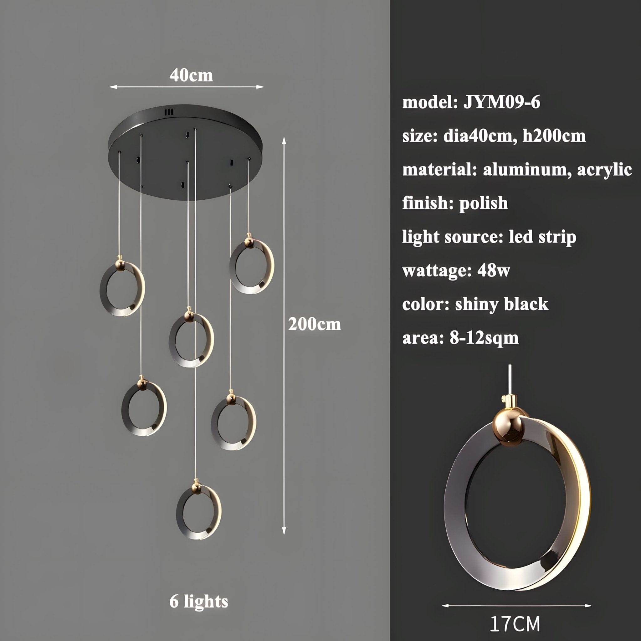 Immerse yourself in the enchanting allure of Nebula, where modern style seamlessly intertwines with futuristic design. Its metal rings are embellished with integrated LED acrylic lights that cast an ethereal glow, transforming your living area, stairwell, or entrance into a captivating space. The adjustable wire spans from 1.5m to 4m, giving you the flexibility to tailor the height to your preferences, making it ideal for various settings such as living rooms, staircases, and lobbies.Meticulously crafted with precision and attention to detail, Nebula features energy-efficient LED lights that offer three adjustable modes: warm, cold white, and color-adjustable light. Compatible with all voltages (90-260 volts), this chandelier guarantees an even and brilliant light for up to 50,000 hours, ensuring a lasting impact on your space.