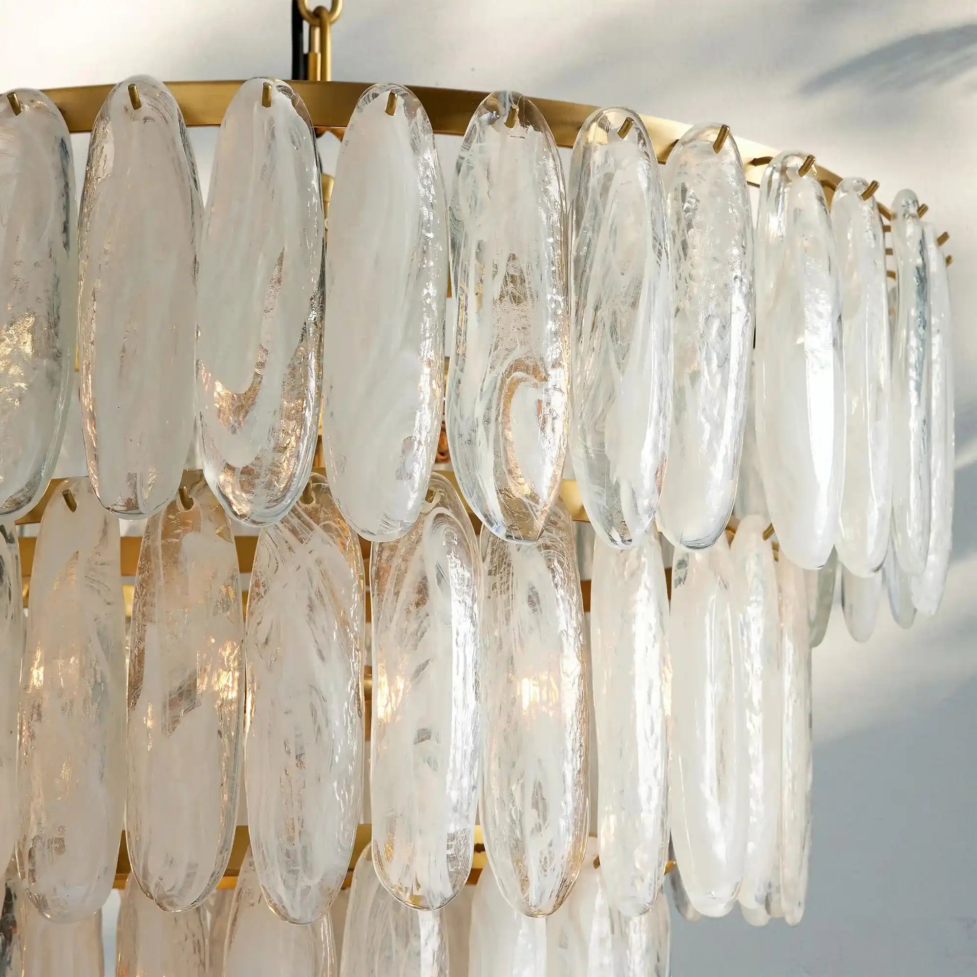 Glowing and glamourous, our Verna Chandelier catches light with three tiers of individually handcrafted swirled glass pieces accented with a warm antiqued brass metal frame.