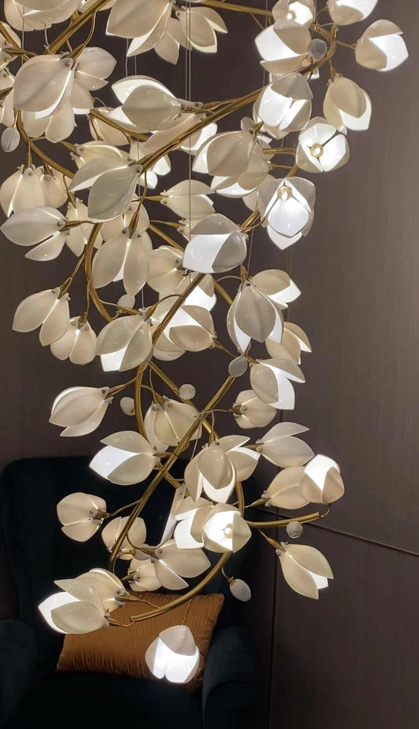 This chandelier is a new product of Lyfairs. Like a cluster of magnolia blossoms hung from the ceiling, this chandelier showcases the appreciation of minimalism. Pure white ceramic as the main material, full of exquisite and innocent feelings. Each magnolia flower contains one single bulb, diffusing and softening the illumination in a moderate and gentle way. Suitable for staircase, high-ceiling space, duplex, villa, etc.