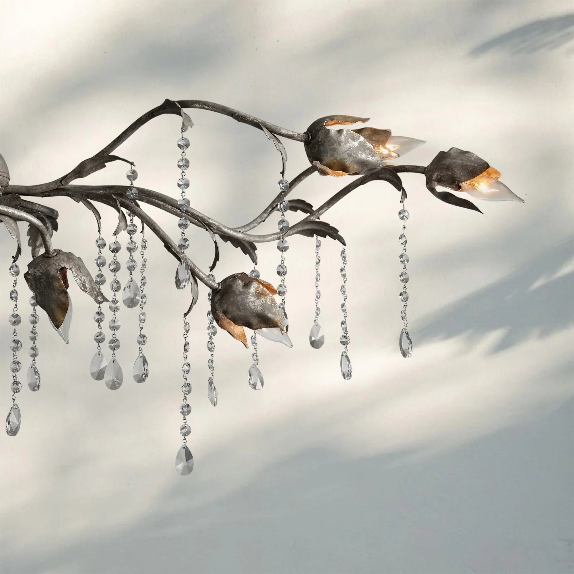 - Crafted by our artisan partners in Italy from hand-moulded iron, featuring a hand-applied silver finish and elegantly hand-strung, faceted glass crystals.