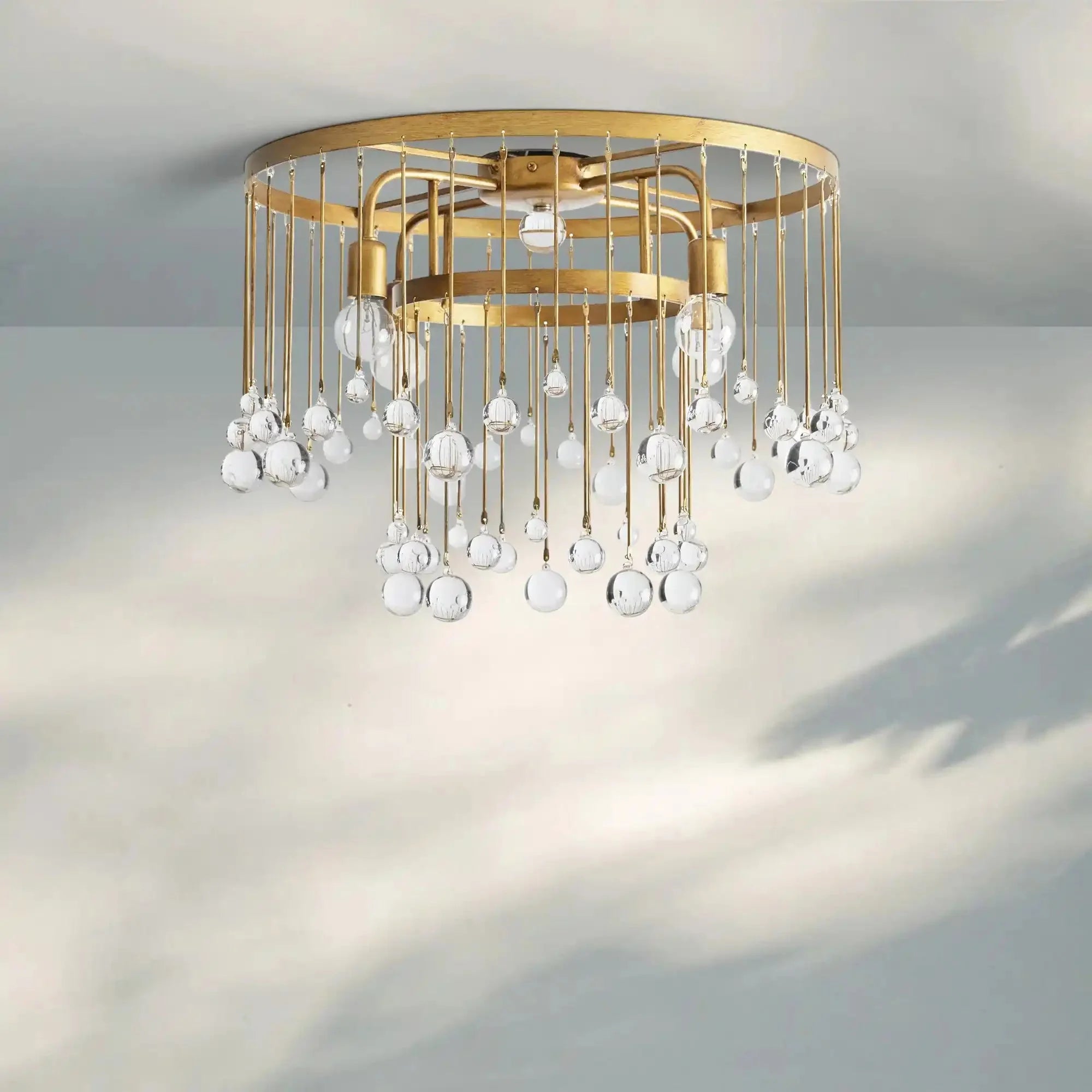 Equally at home in an ancient French castle or a downtown New Orleans loft, our Aubrey Flushmount creates dramatic ambiance in any setting. Crystal drops hanging in varying lengths from an iron cage create the illusion of movement as they catch the light, refracting brilliant beams around your room.
