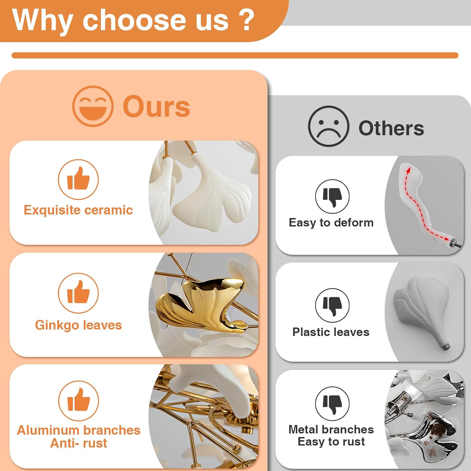 Bring a touch of nature’s elegance to any room with this 40‑inch gold ceramic chandelier, featuring handcrafted ginkgo leaves that sparkle under warm white light. The adjustable brass branches let you shape the design to fit your ceiling, while eight G9 sockets provide ample illumination. Crafted from aluminum, brass, and frosted ceramic, the fixture combines durability with a polished finish for a truly luxurious look. Perfect for dining rooms, living areas, kitchens, or entryways, this chandelier transforms ordinary spaces into stylish havens.