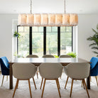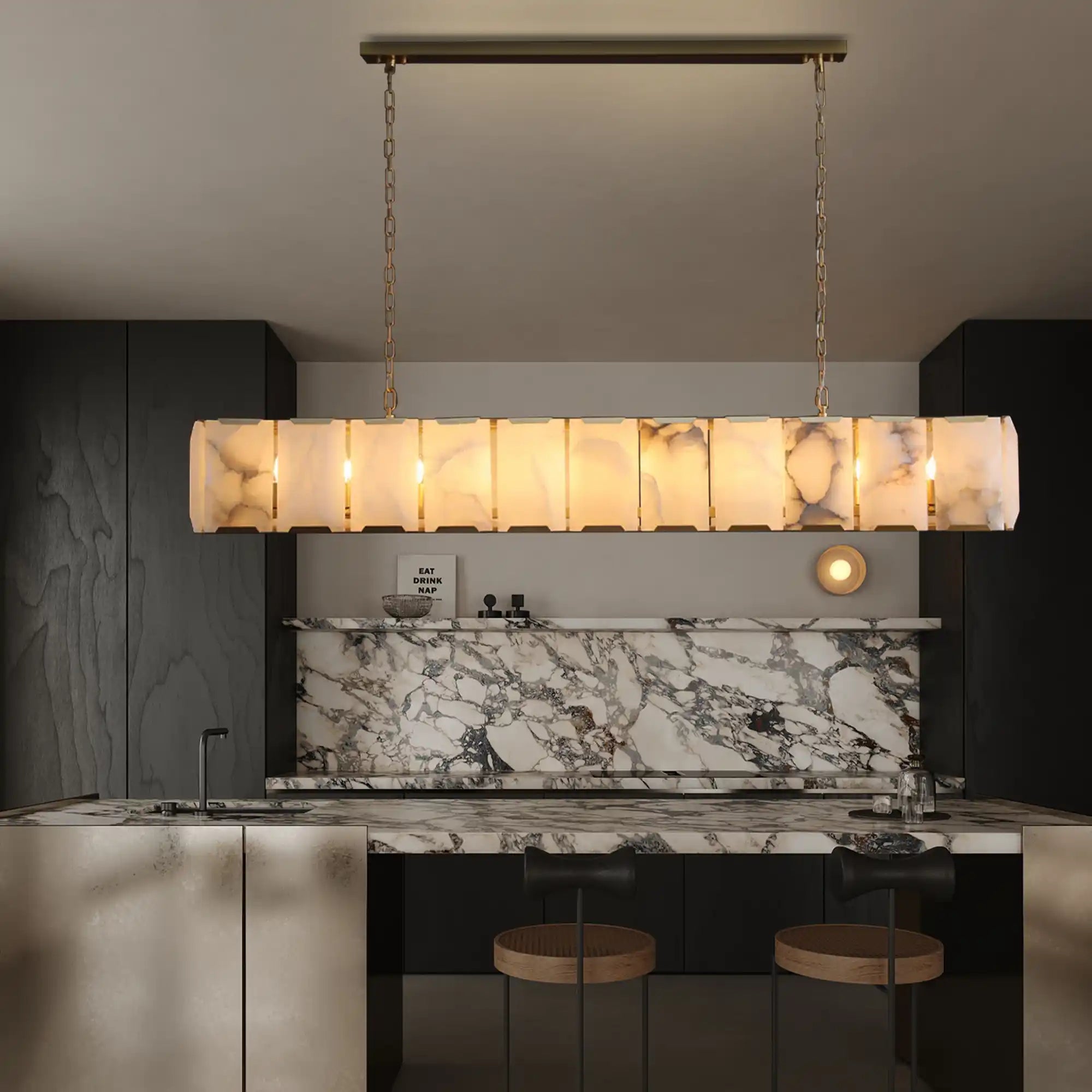 The Herlow Calcite Rectangular Chandelier features natural alabaster stone panels and brushed brass accents. Perfect for long dining tables and kitchen islands, this modern linear chandelier emits a soft, diffused glow that enhances contemporary interiors. Available in custom sizes and finishes.