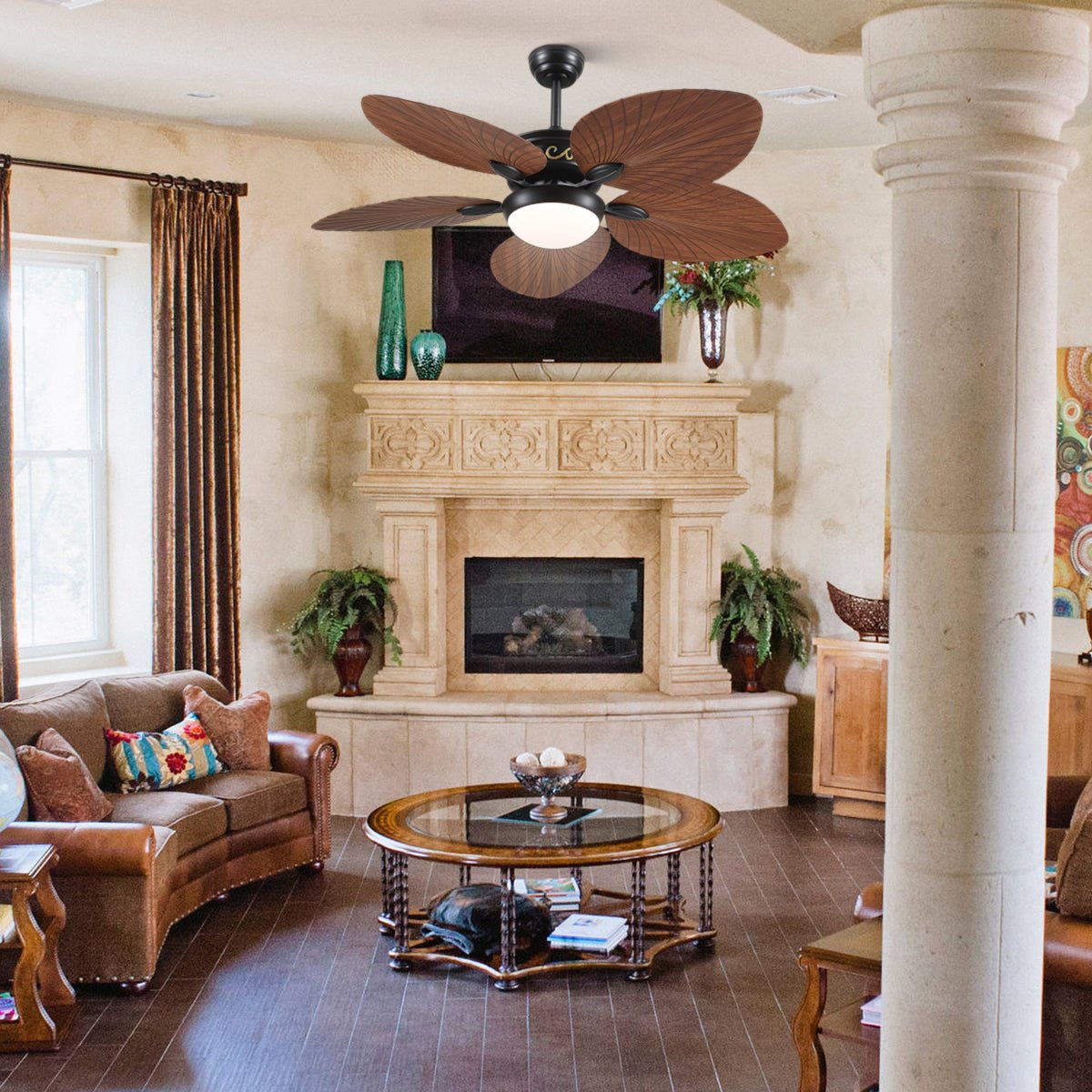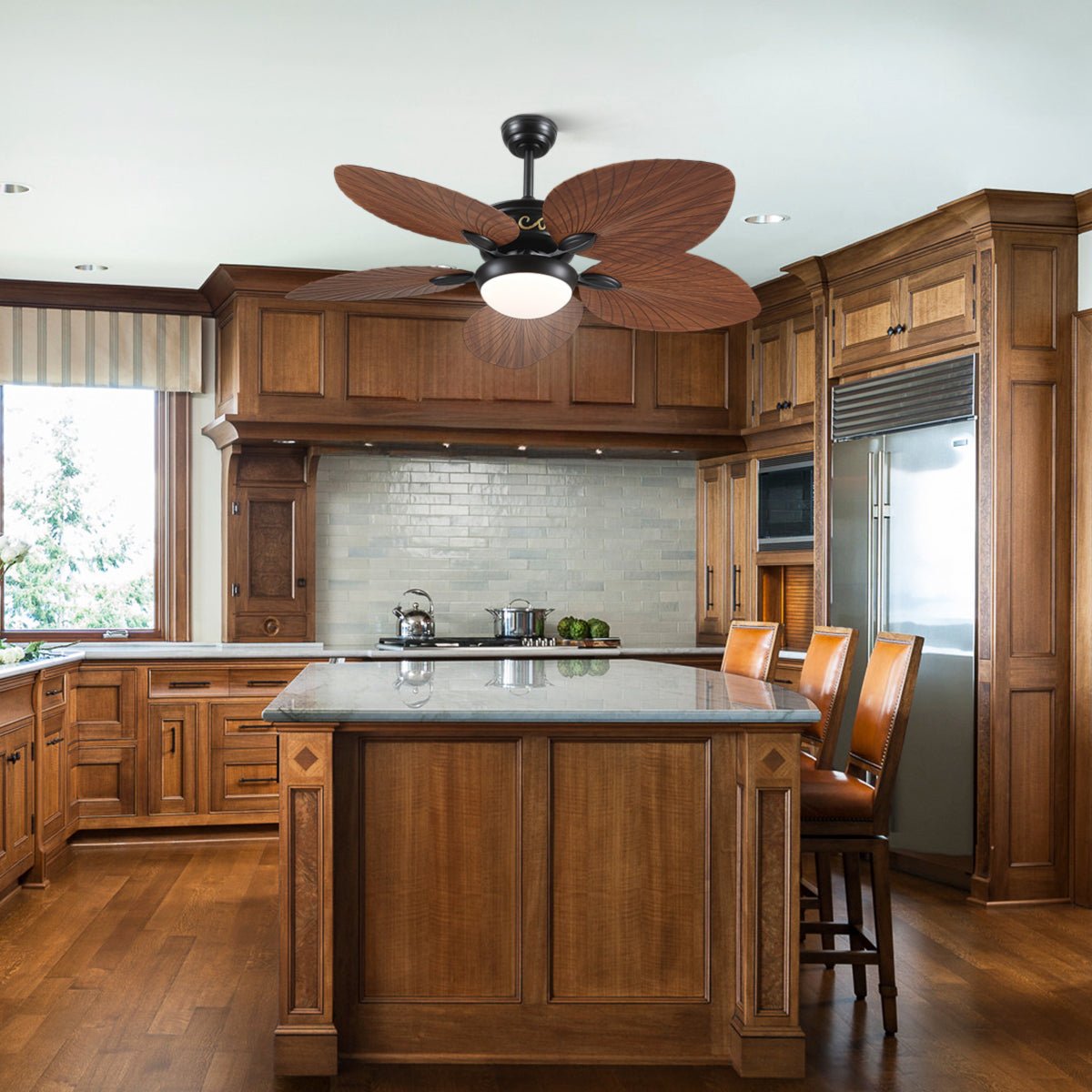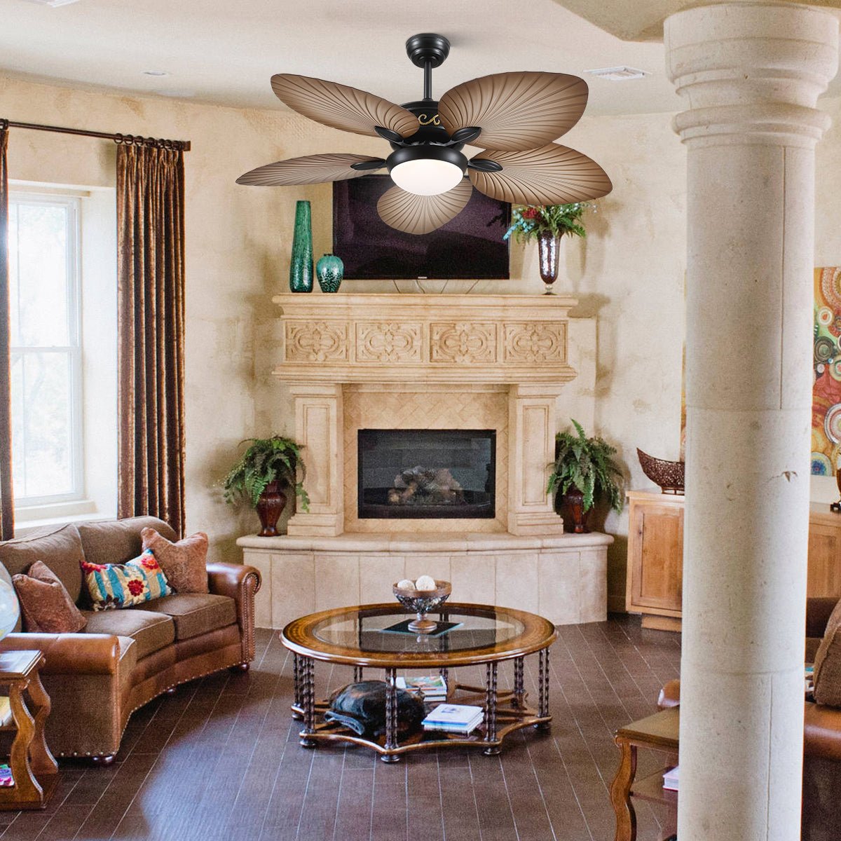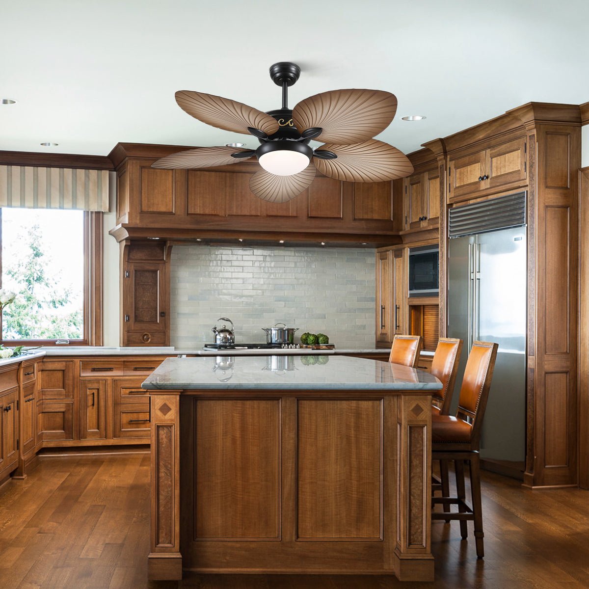 - This palm leaf ceiling fan with light uses an efficient and silent DC motor to minimize wind noise.