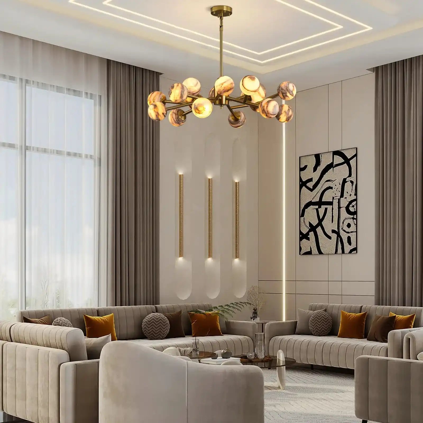 - Iconic Mid Century Modern Design: Elevate your space with this stunning Sputnik chandelier. Featuring a sleek, minimalist silhouette in a sophisticated gold finish and 12 unique alabaster globes, it radiates timeless elegance and adds a warm, harmonious glow perfect for contemporary homes.