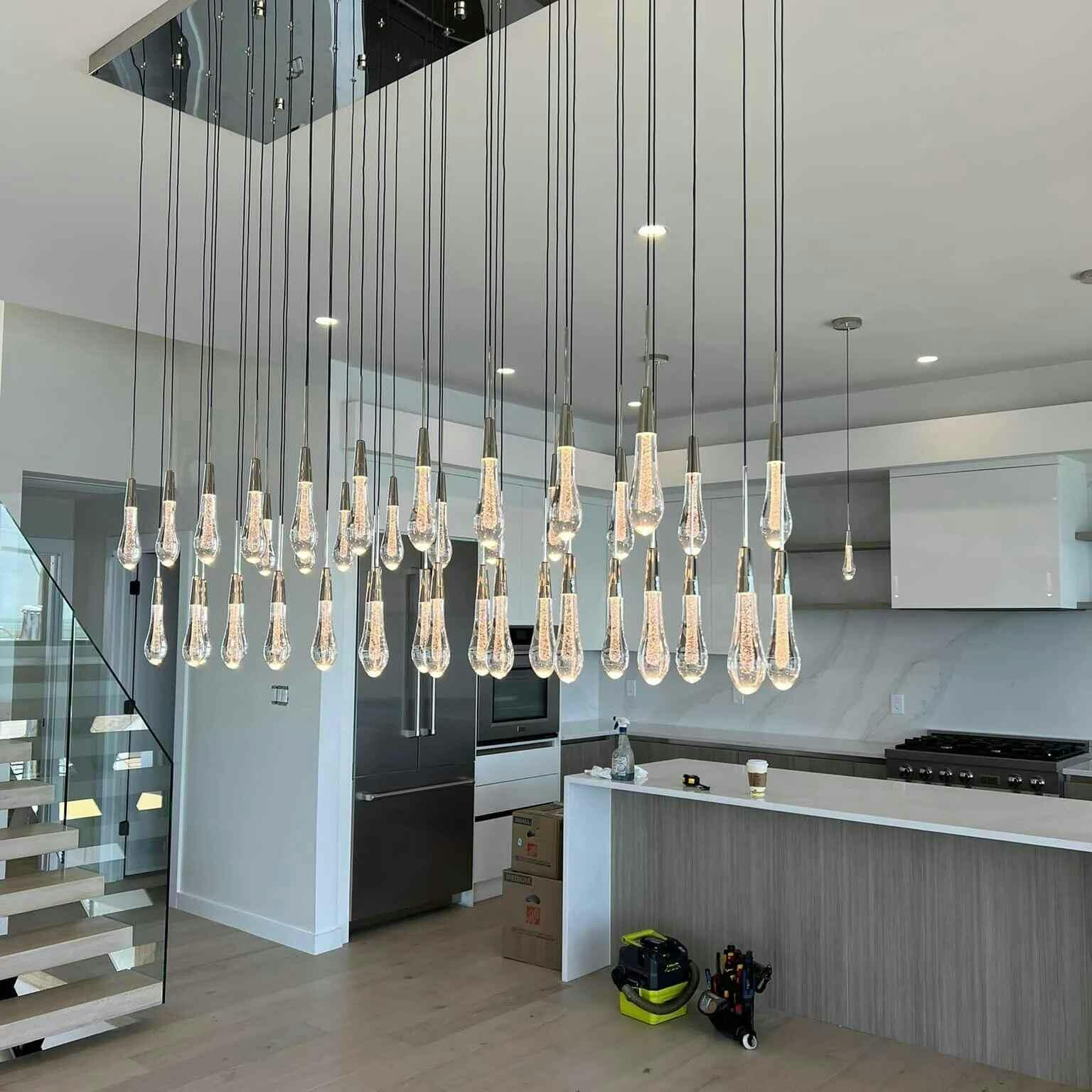 Featuring adjustable black PVC cords cascading into integrated LED lights handcrafted from seeded glass, our Soltaire Lighting Collection mimics the look of a fallen raindrop.