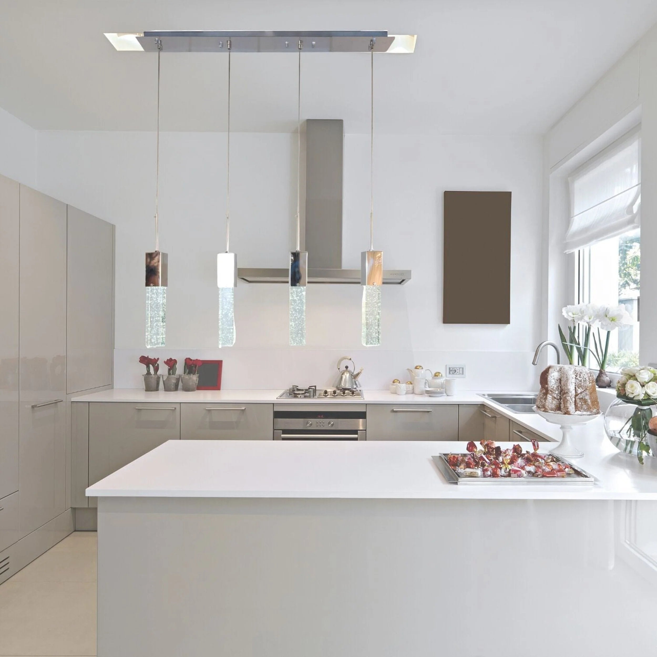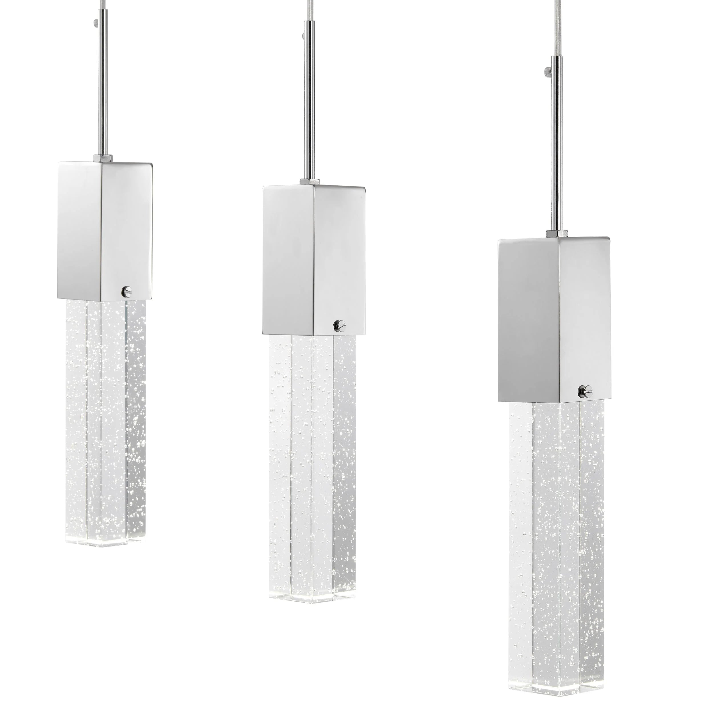 This Finesse Decor Sparkling Night Chandelier is a 4 light piece made from high end glass crystal and a chrome metal finish. It is a representation of style and grace combined with chic and modern. you can't go wrong!The four crystal hanging chandelier light is perfect and versatile for many different spaces. The crystal pendants have floating bubbles that give it that sparkling look and reflect in a luxurious and glamorous way. Each wire of each crystal is adjustable to your desire. Perfect over a counter or kitchen island. This is one of our best seller products from our crystal collection.The Sparkling Night Chandelier is a breath-taking piece that will exceed your exceptions!