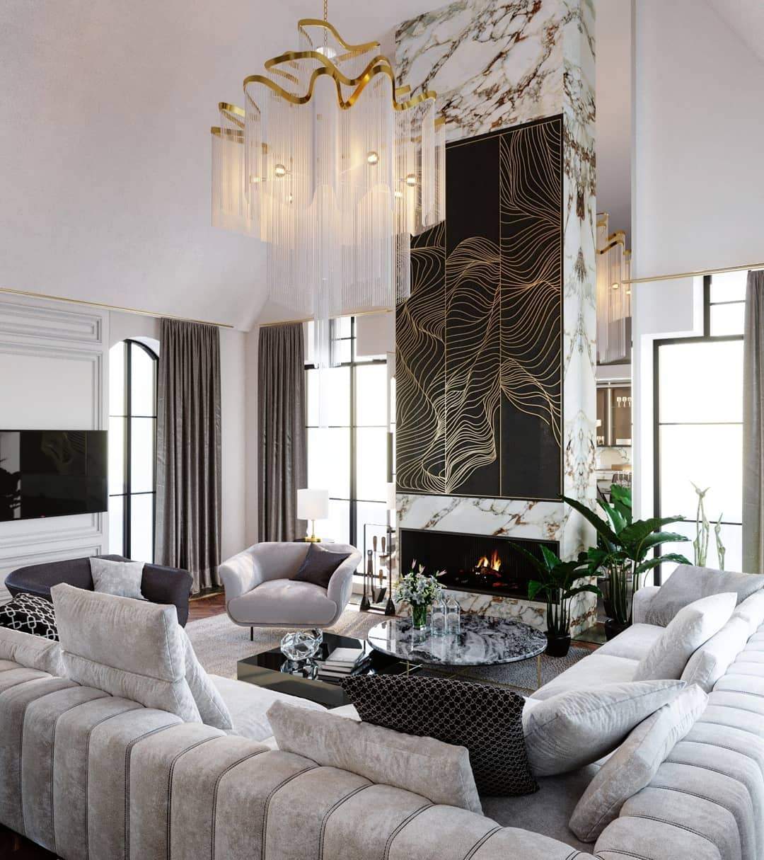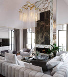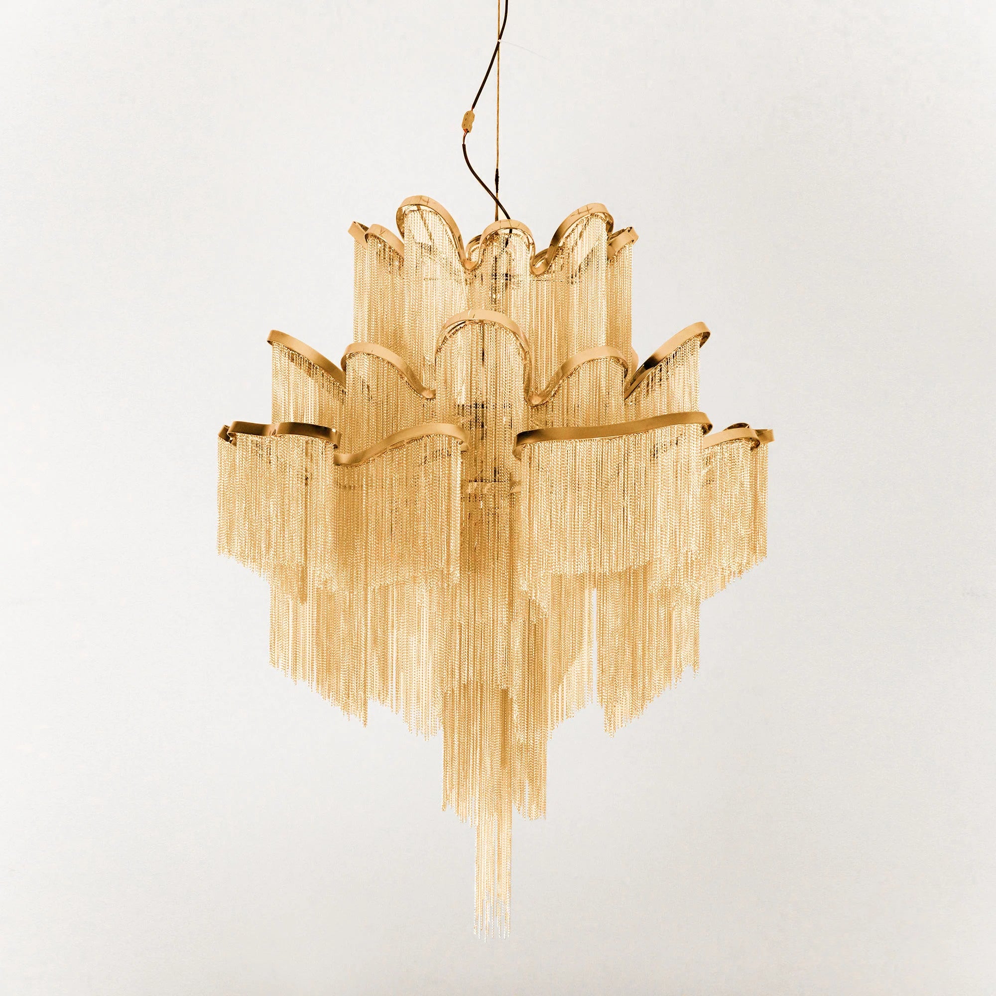 This chandelier has a stainless steel frame that is crafted for elegance from top to bottom. A long cluster of steel chains resembles a progressive waterfall with ethereal tones. The frame is cloud-like and full of curves. The colors, including silver and gold, highlight the design's sophisticated personality and stylish presence. This look offers a unique dazzle and shine that is suitable for a variety of rooms with high ceilings, from staircases to dining rooms, and commercial areas as well. This chandelier is absolutely stunning whether the lights are on or off.