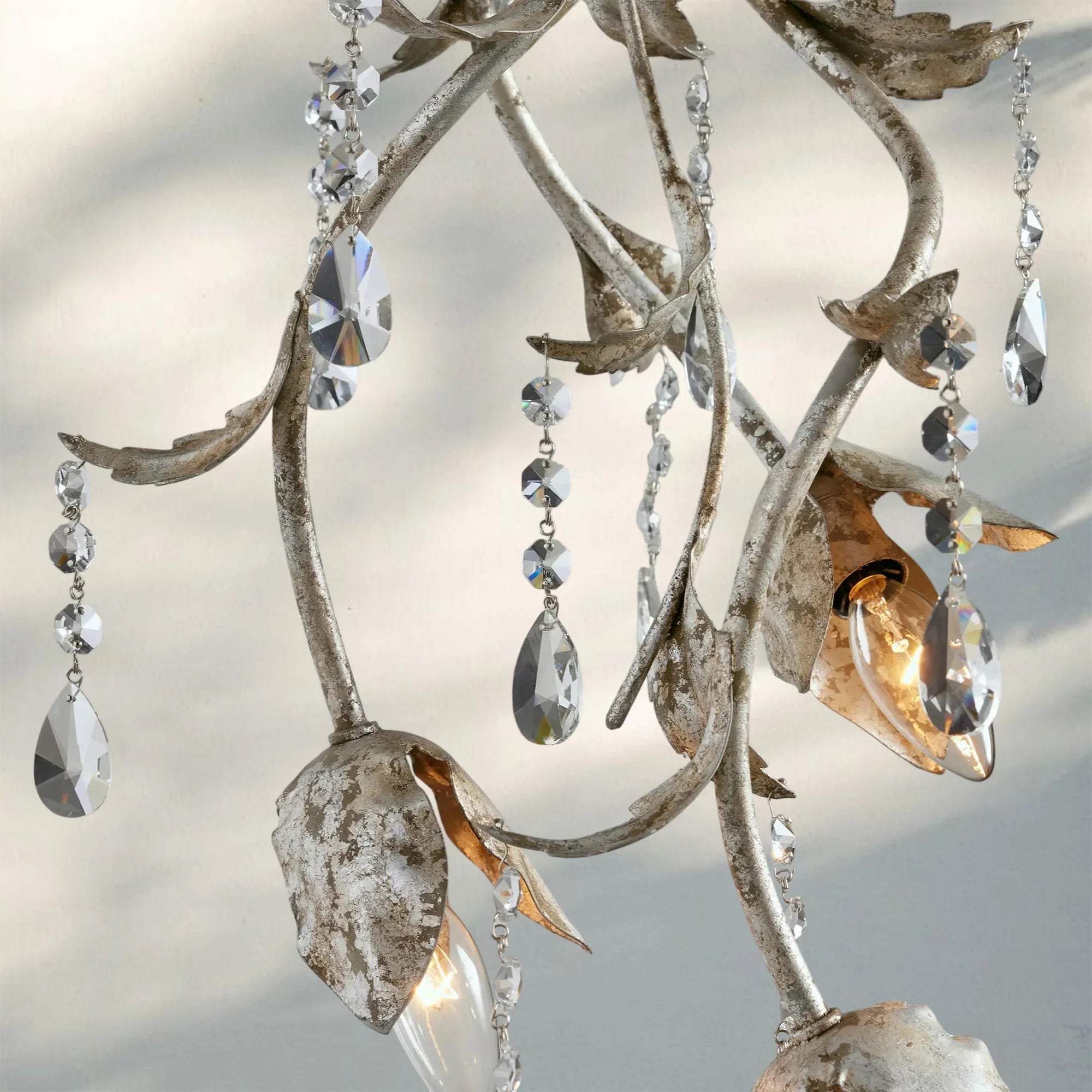 Crafted by our artisan partners in Italy from hand-moulded iron, featuring a hand-applied silver finish and elegantly hand-strung, faceted glass crystals.