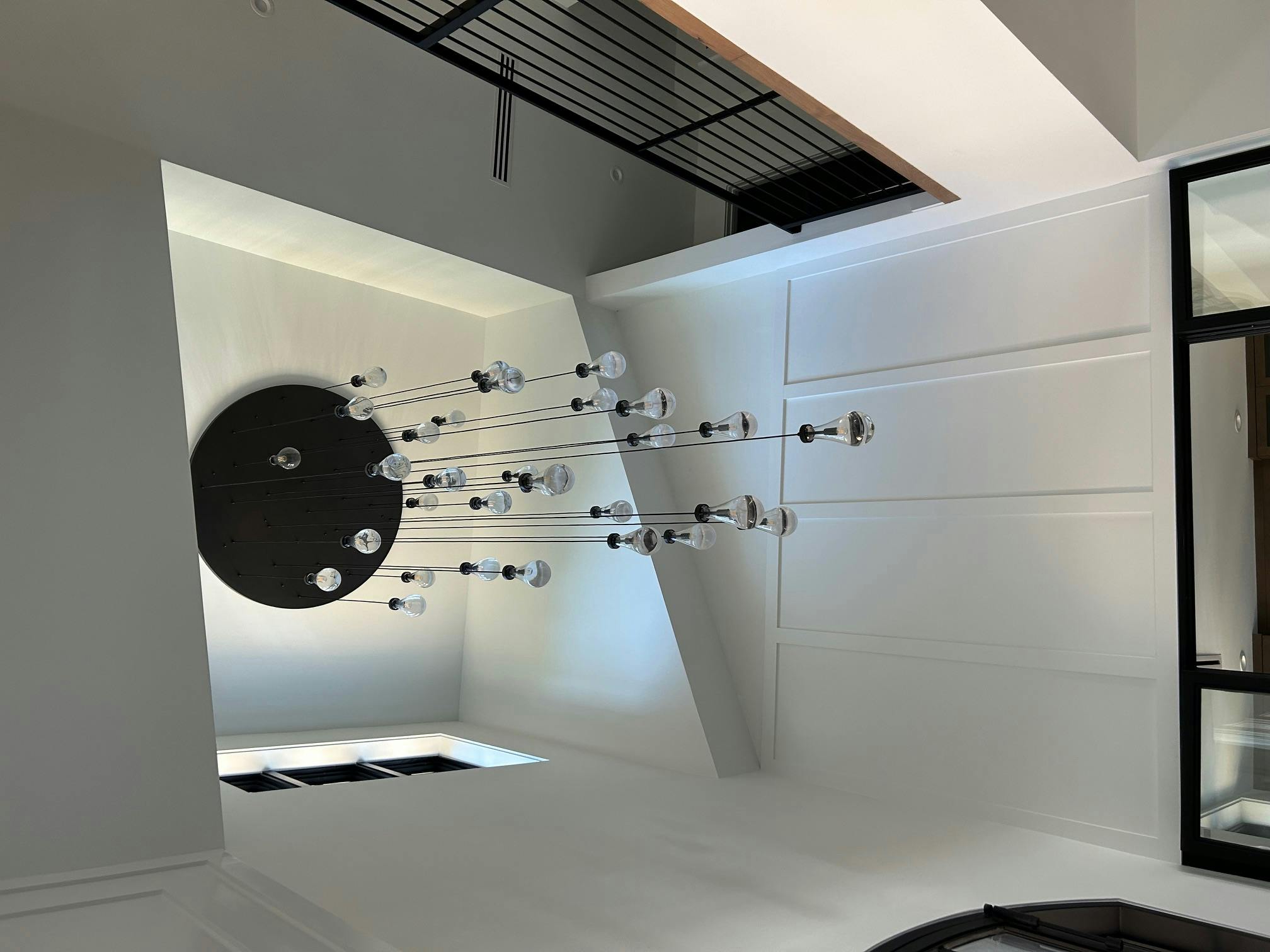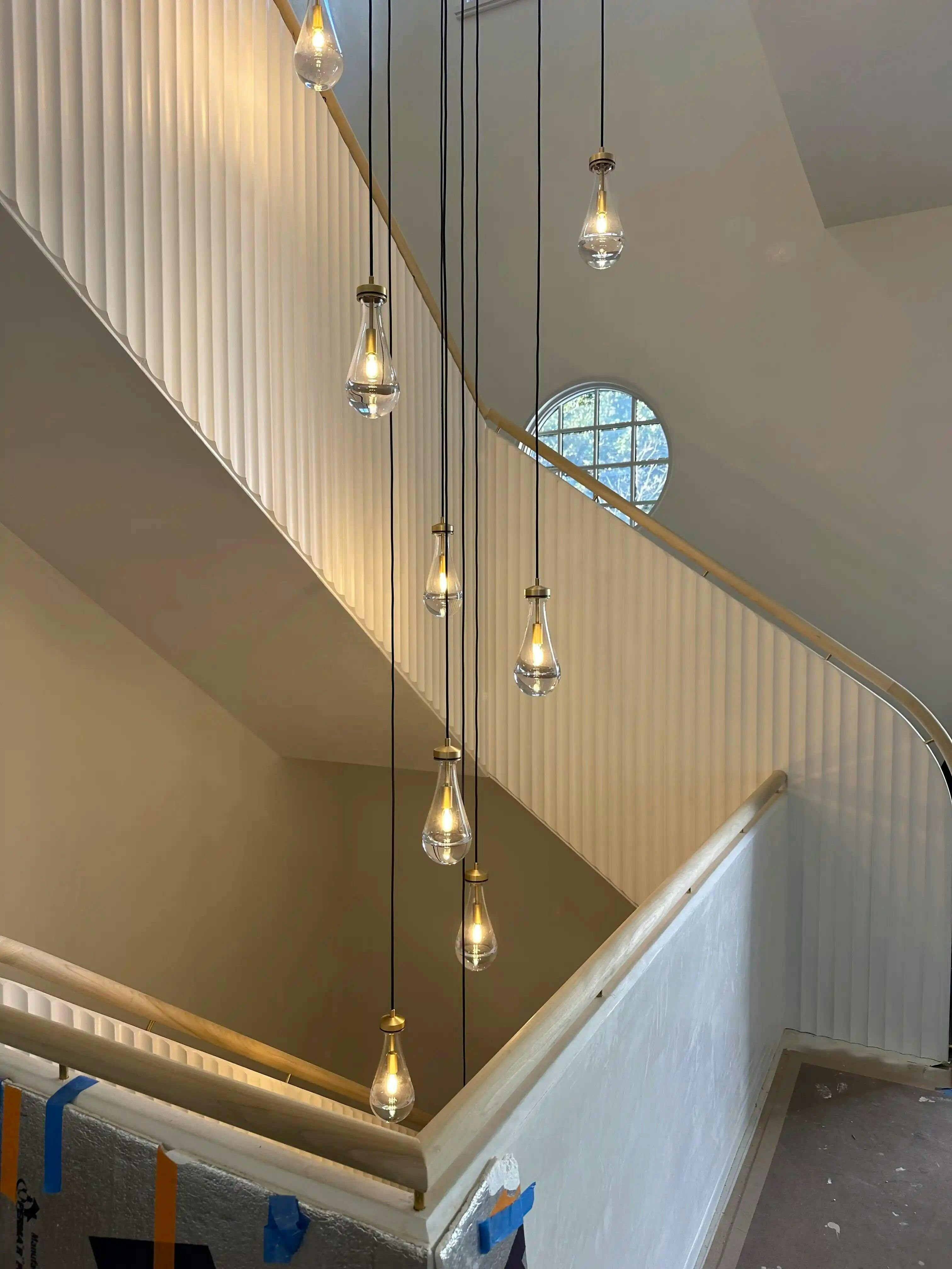 - Glass drops are suspended from black fabric cord; cord length may be altered at the time of professional installation