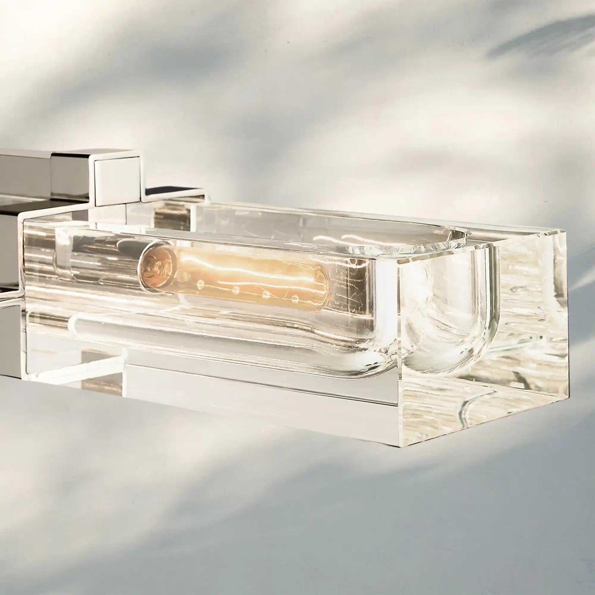 In our Saviler collection, renowned San Francisco designer Jonathan Browning has created a masterful study of solid and void. A monumental block of crystal is carved with a concave channel to hold an Edison bulb and set in a frame of solid brass. The crystal reveals its solidity when illuminated, refracting and reflecting the bulb within, but takes on a weightless transparency when dark.