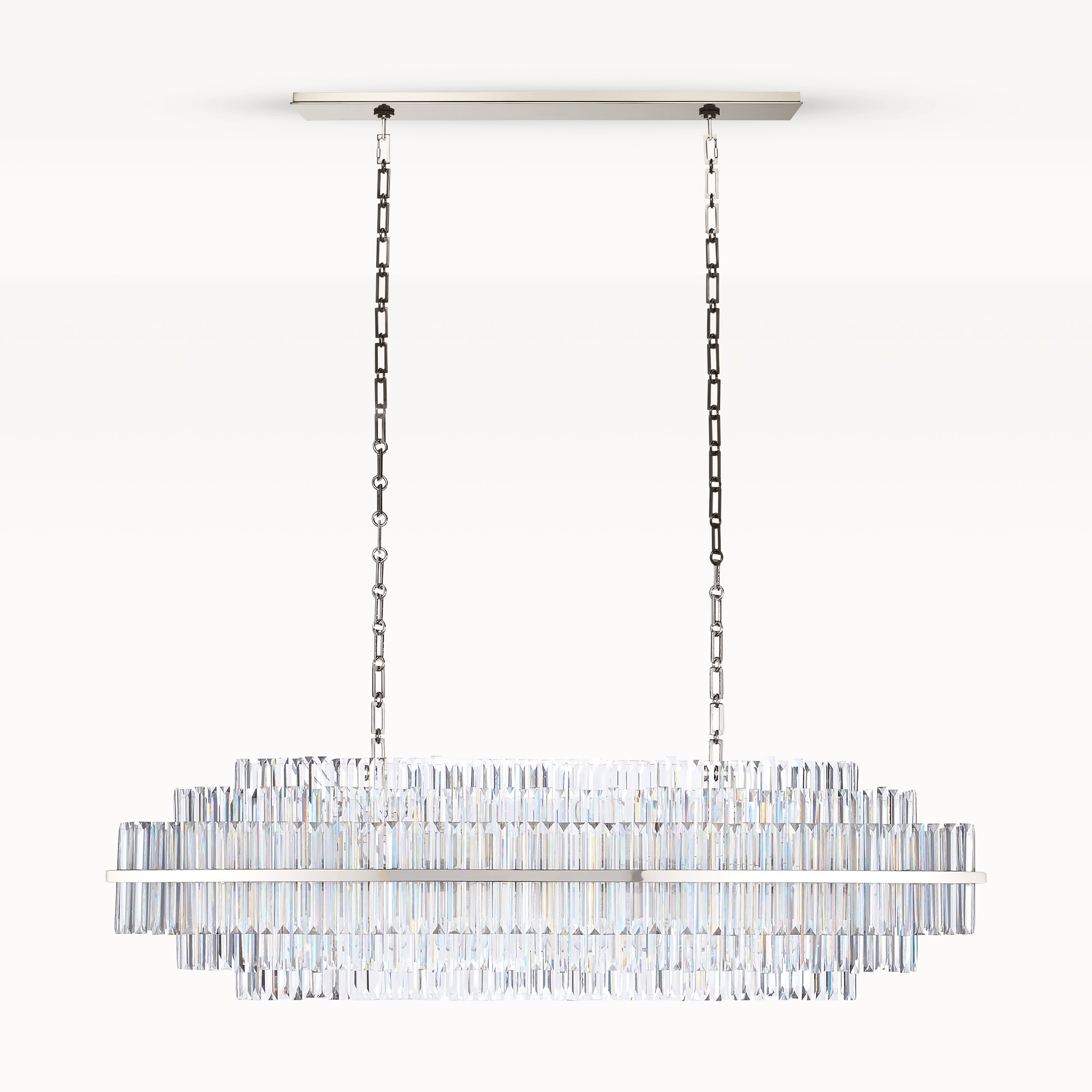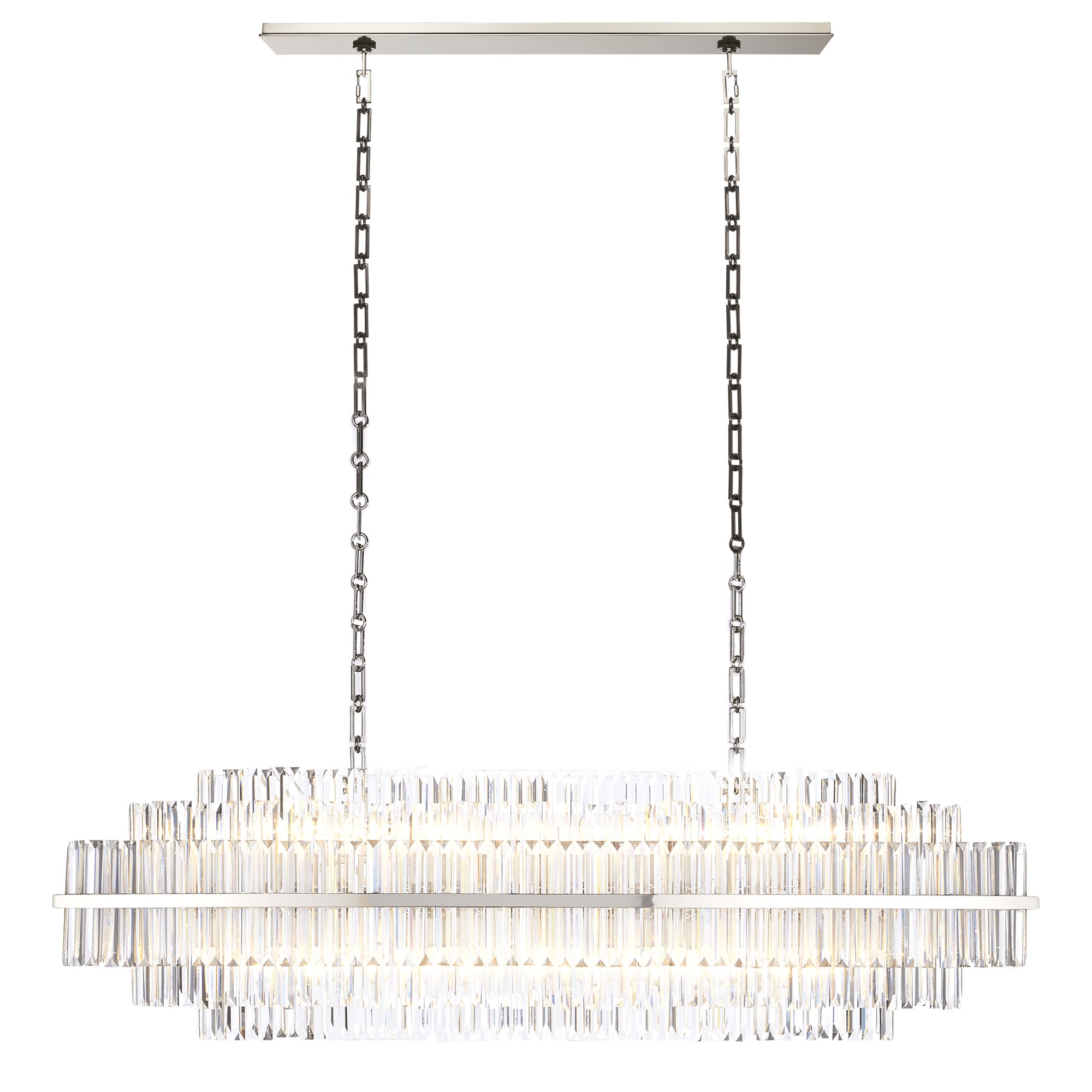 Hundreds of prismatic glass rods encircle a steel frame, lending a radiant glow when illuminated. The concentric, tiered design is inspired by glamorous 1930s art deco lighting and makes a dazzling statement piece in the entry or hall, or above the dining table.