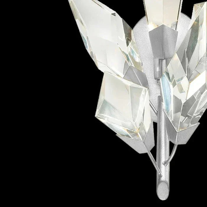 Inspired by nature and its majestic forests, this silver leafed Foret sconce features modern branches adorned with bold, hand-cut faceted crystal leaves. Also available in gold leaf.