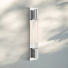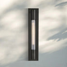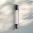 The collection was inspired by streamlined modern architecture to design this wall light. A slender column of ribbed glass floats on the wall between two metal fittings. The sturdy back plate has chamfered edges and exposed screws, giving the fixture an industrial aesthetic.