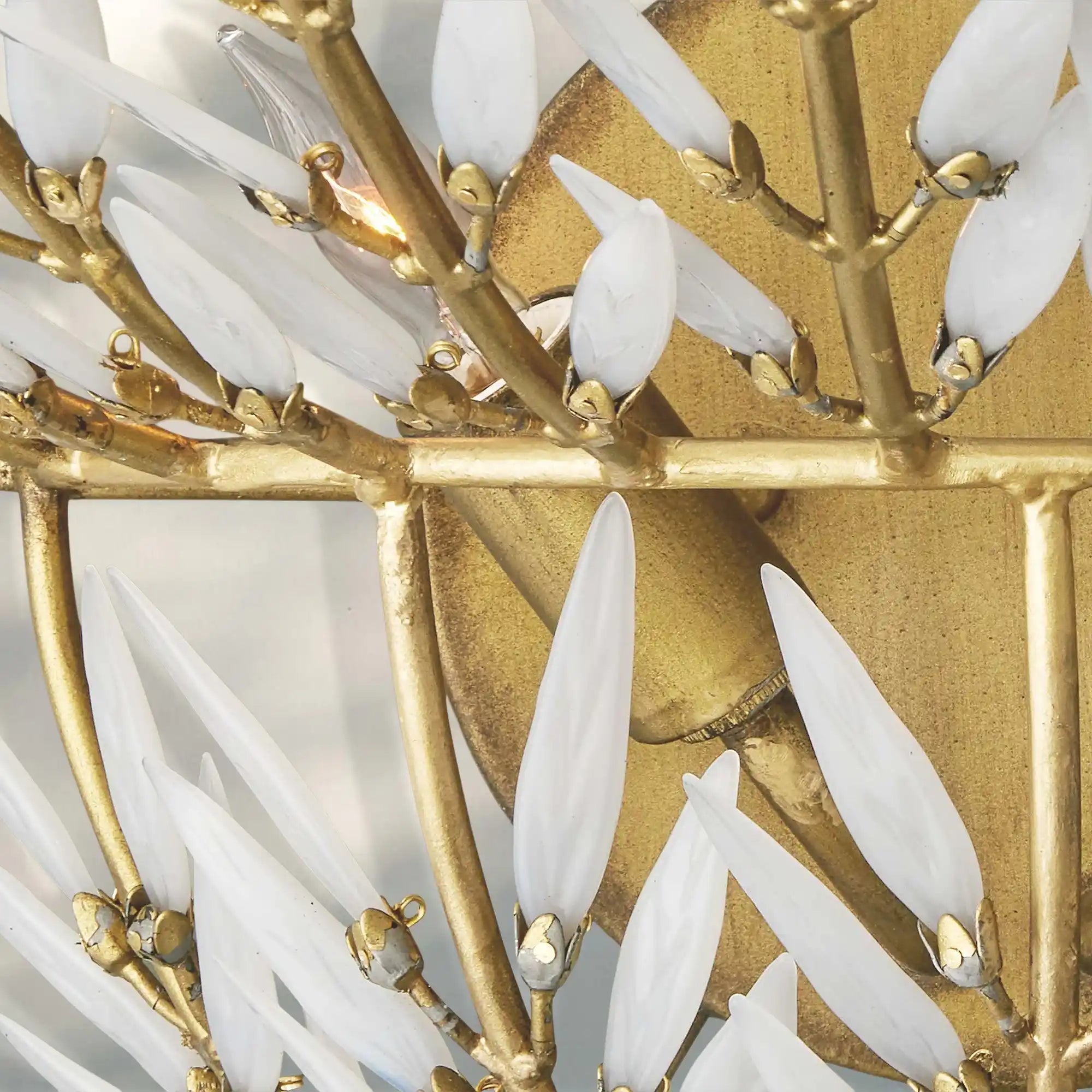 Our Morrigan Lighting Collection features vintage inspiration in three tiers of white glass leaves that fan across brass arcs—creating movement and subtle texture in an elevated, sculptural light.