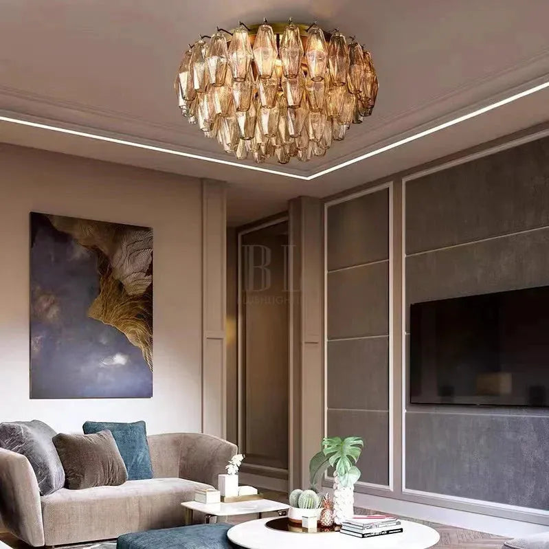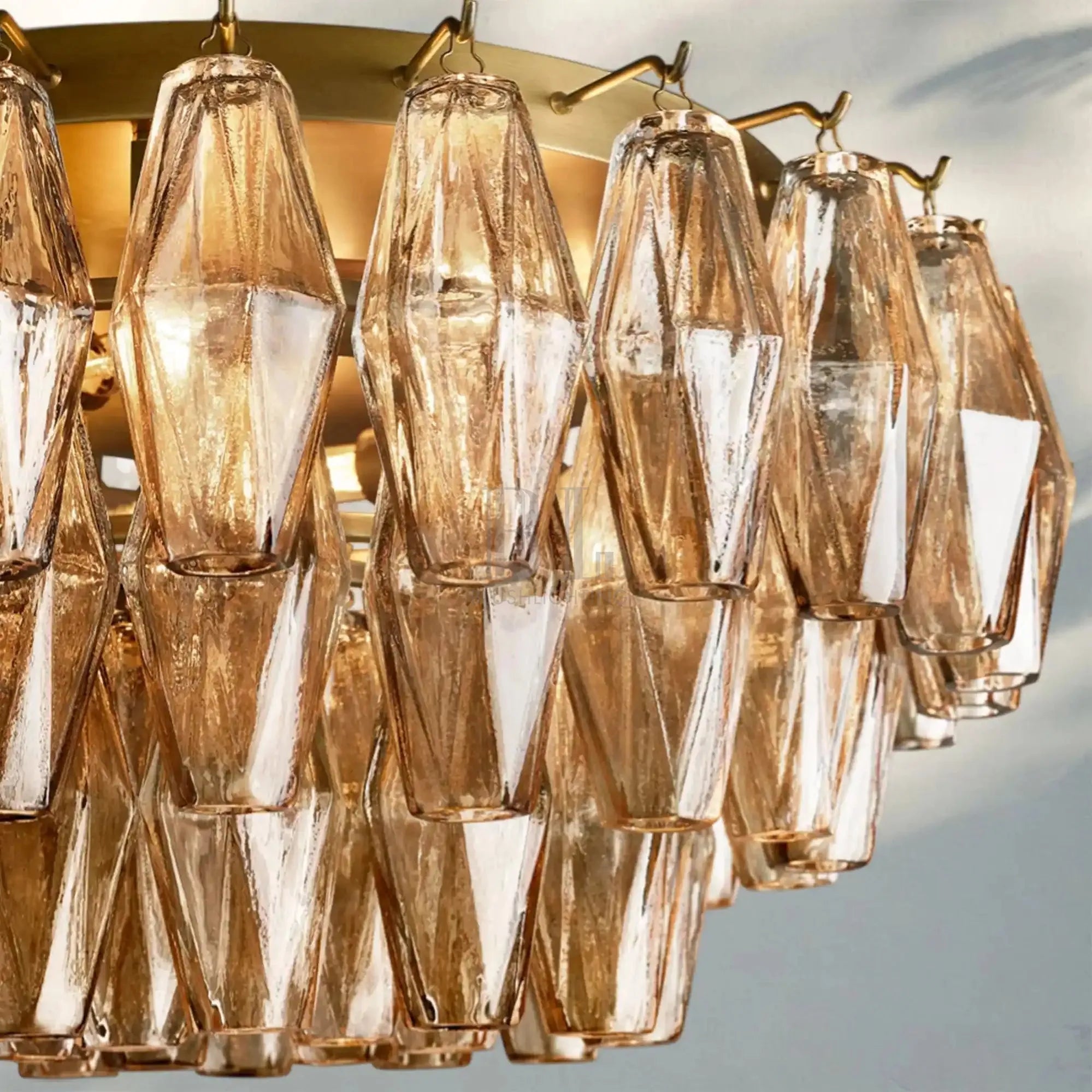 Our fixtures celebrate the minimalist spirit of the period in a grand way. From a cascading steel frame, dozens of hand-blown glass polyhedra hang from individual hooks. Illuminated from within, the faceted chandelier greatly reflects and refracts light.