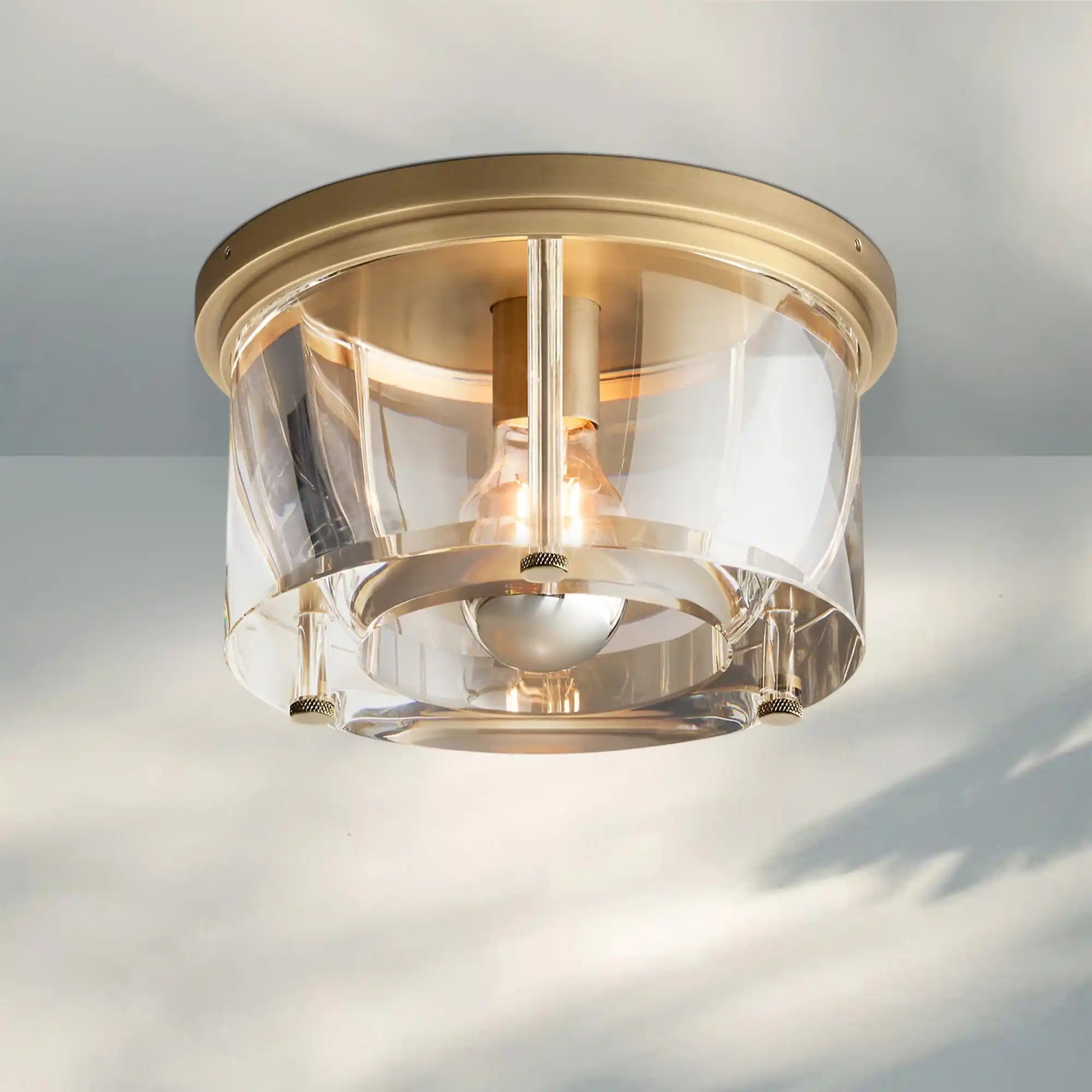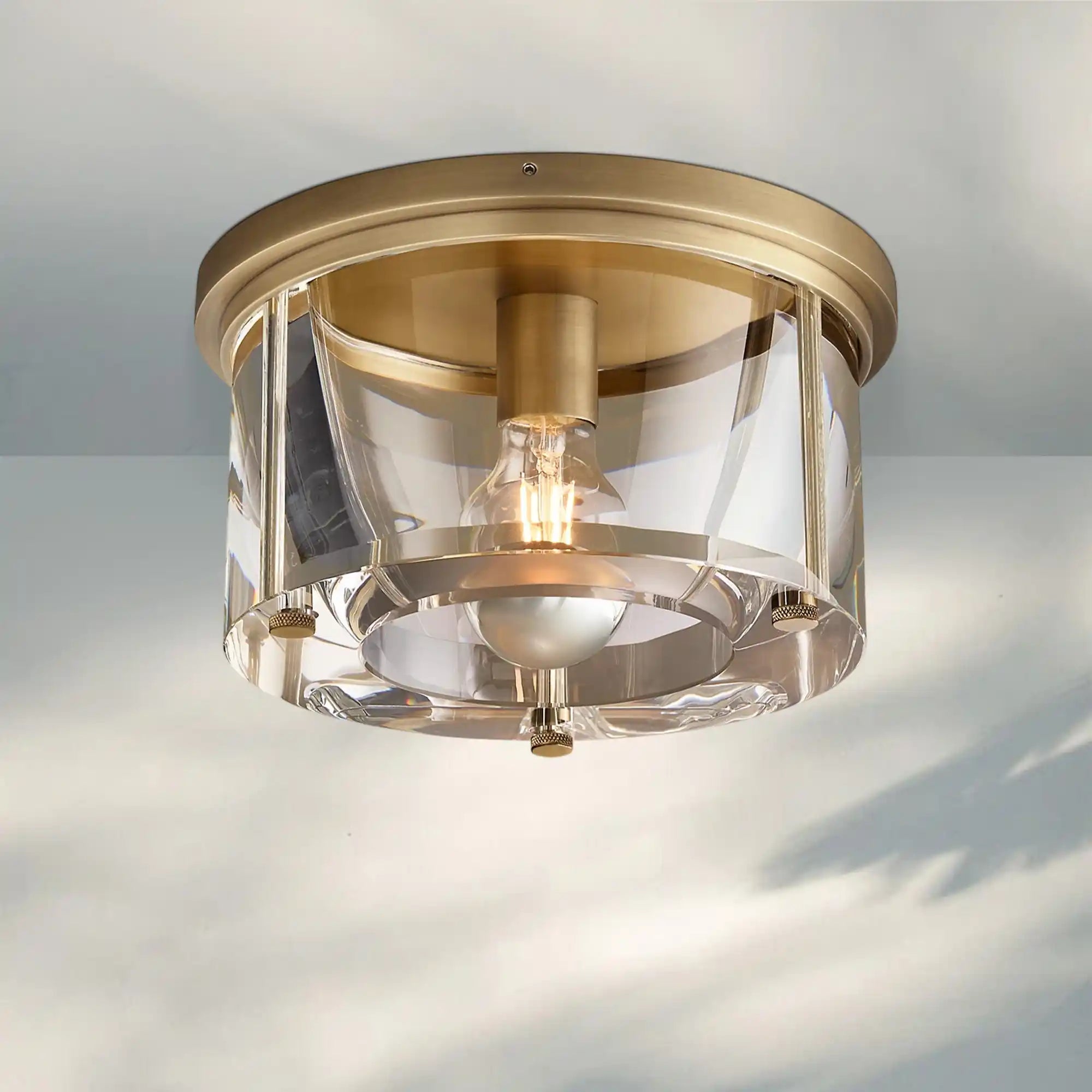 - Handcrafted of sand-cast brass and K9 glass